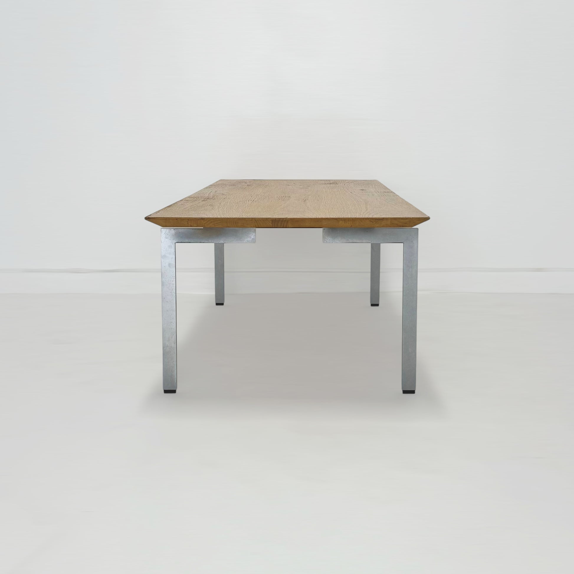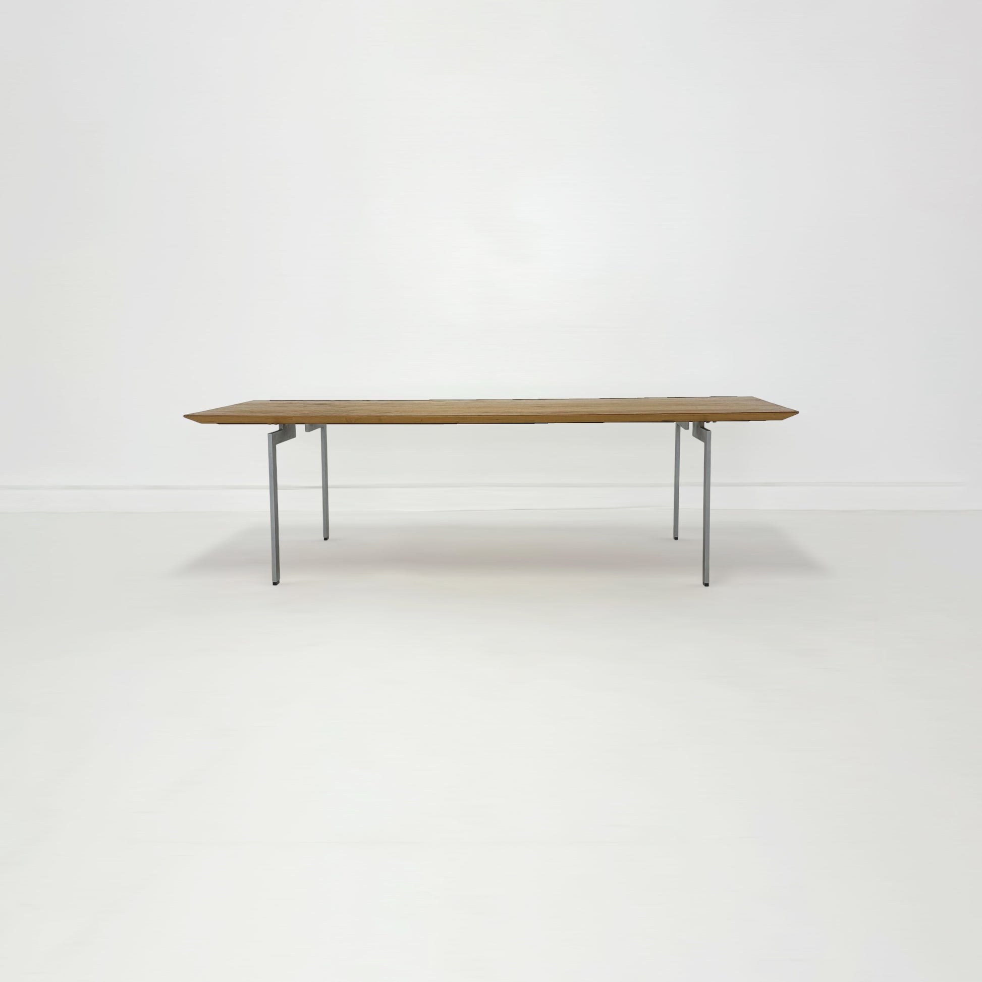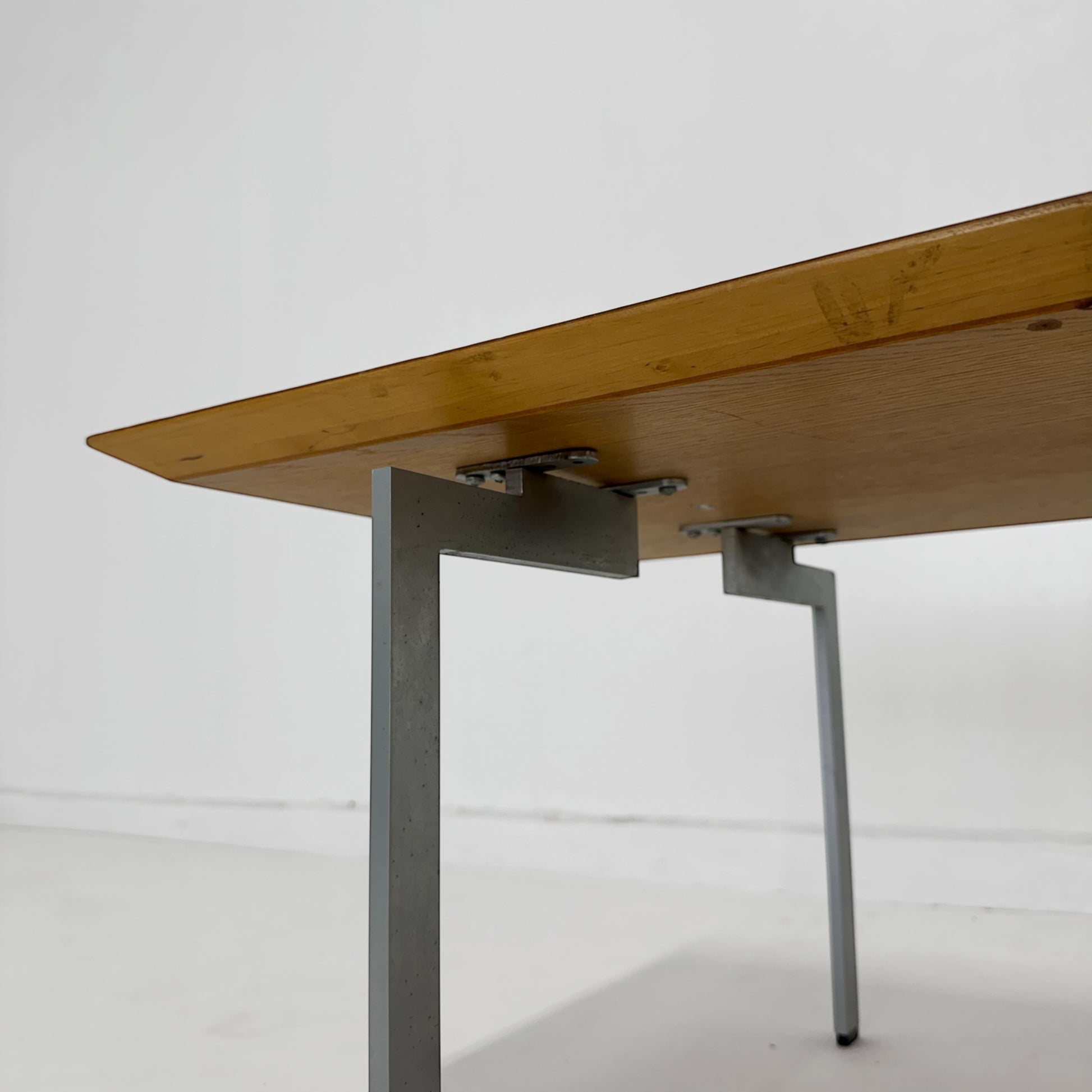 積層天板とシャープなスチール脚を組み合わせたシンプルなデザイン。浮遊感のある脚部が特徴的で、北欧家具らしい遊び心も取り入れています。