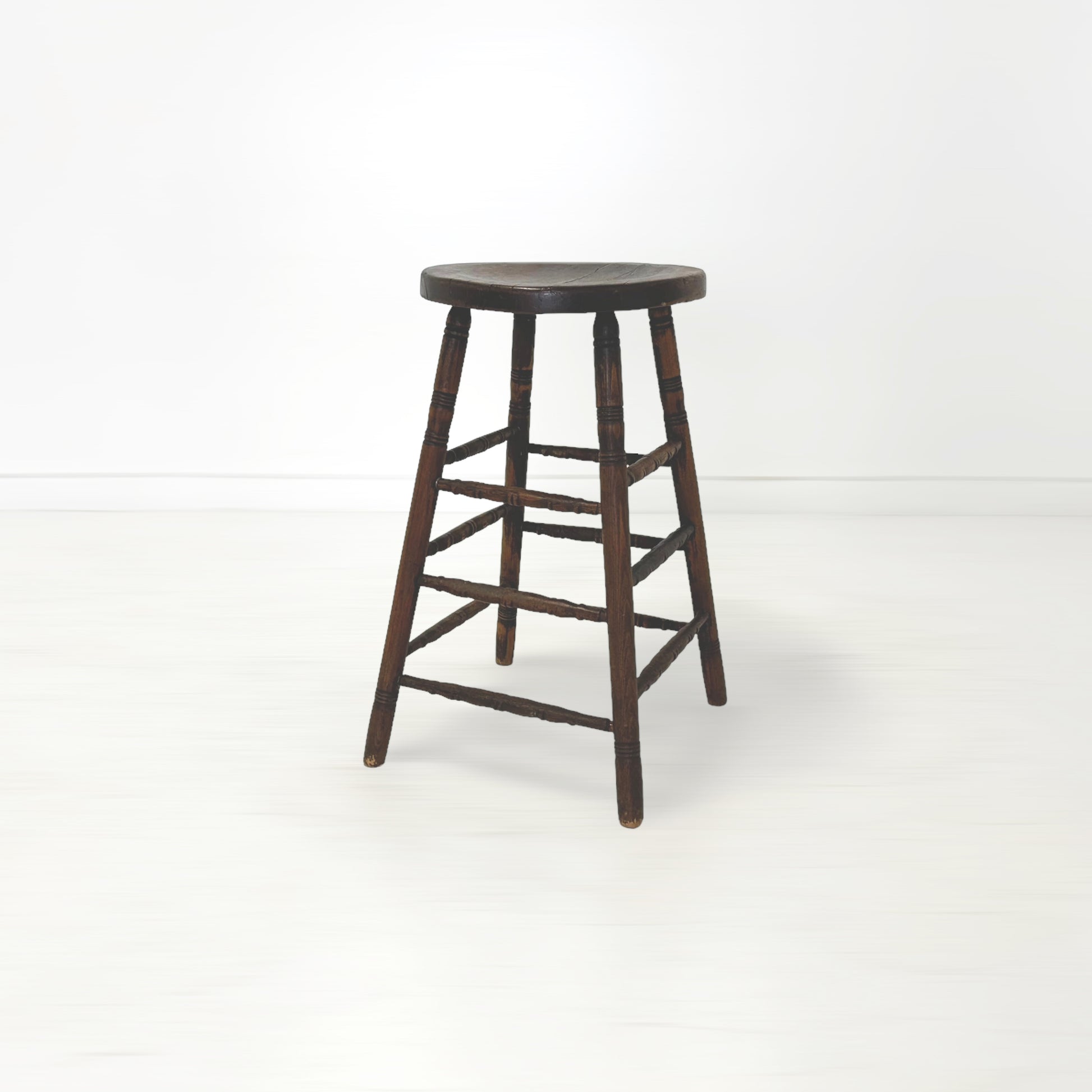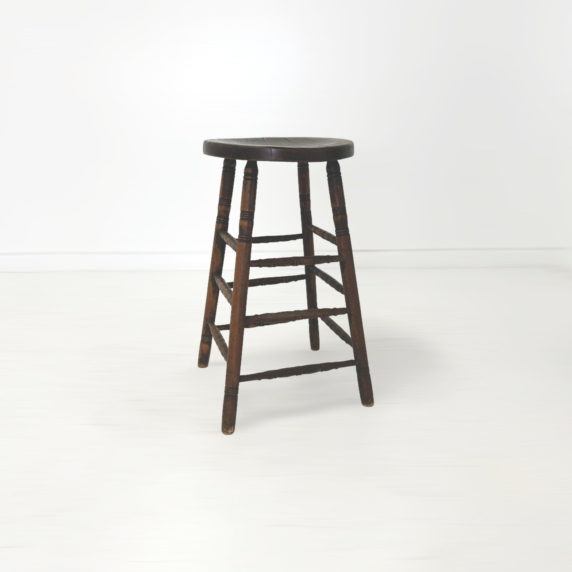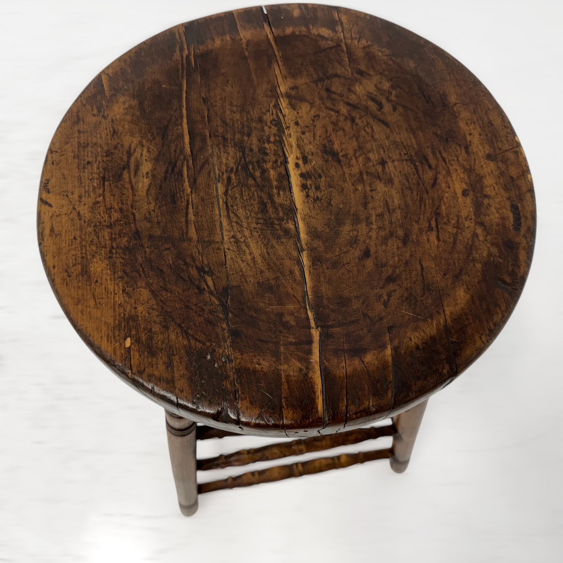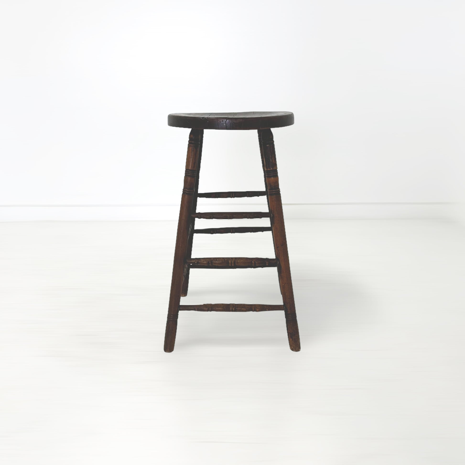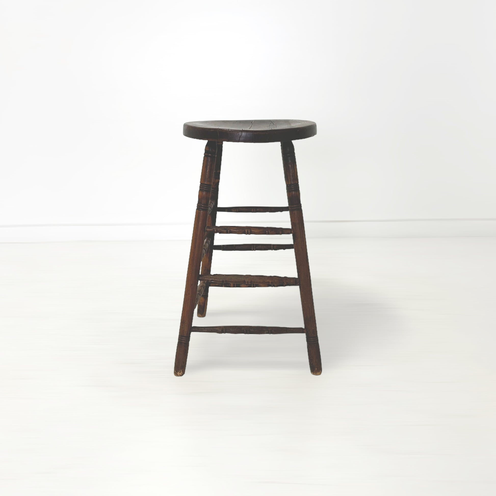 脚の貫が3本もある珍しいデザインのウッドスツールです。