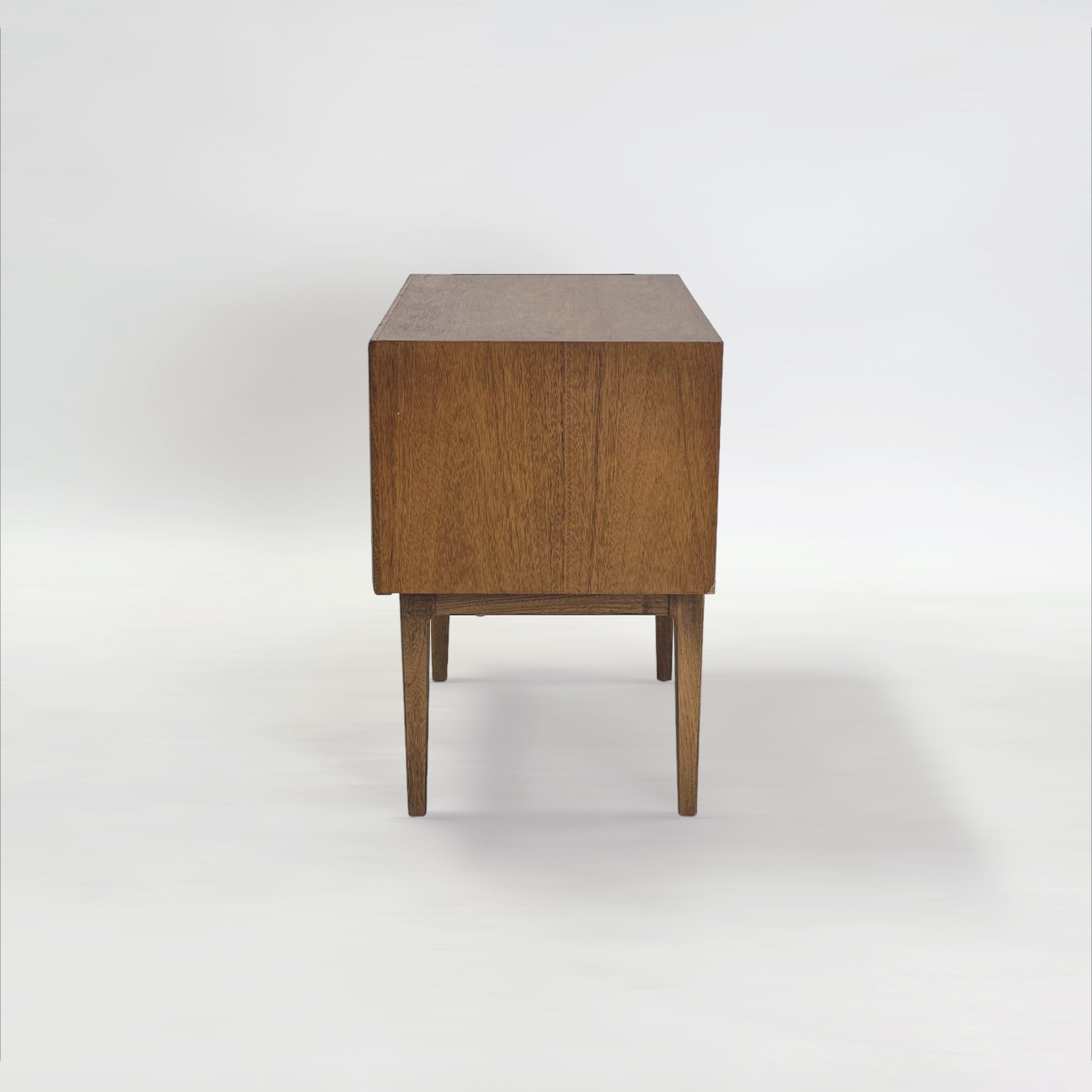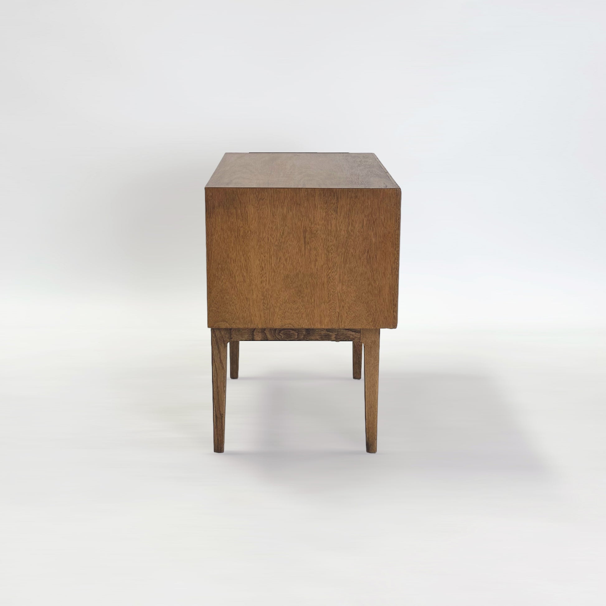 ウォールナットの木目と真鍮のゴールドの取っ手が特徴で、ミッドセンチュリーモダンデザインのシンプルさと洗練された雰囲気を醸し出しています。