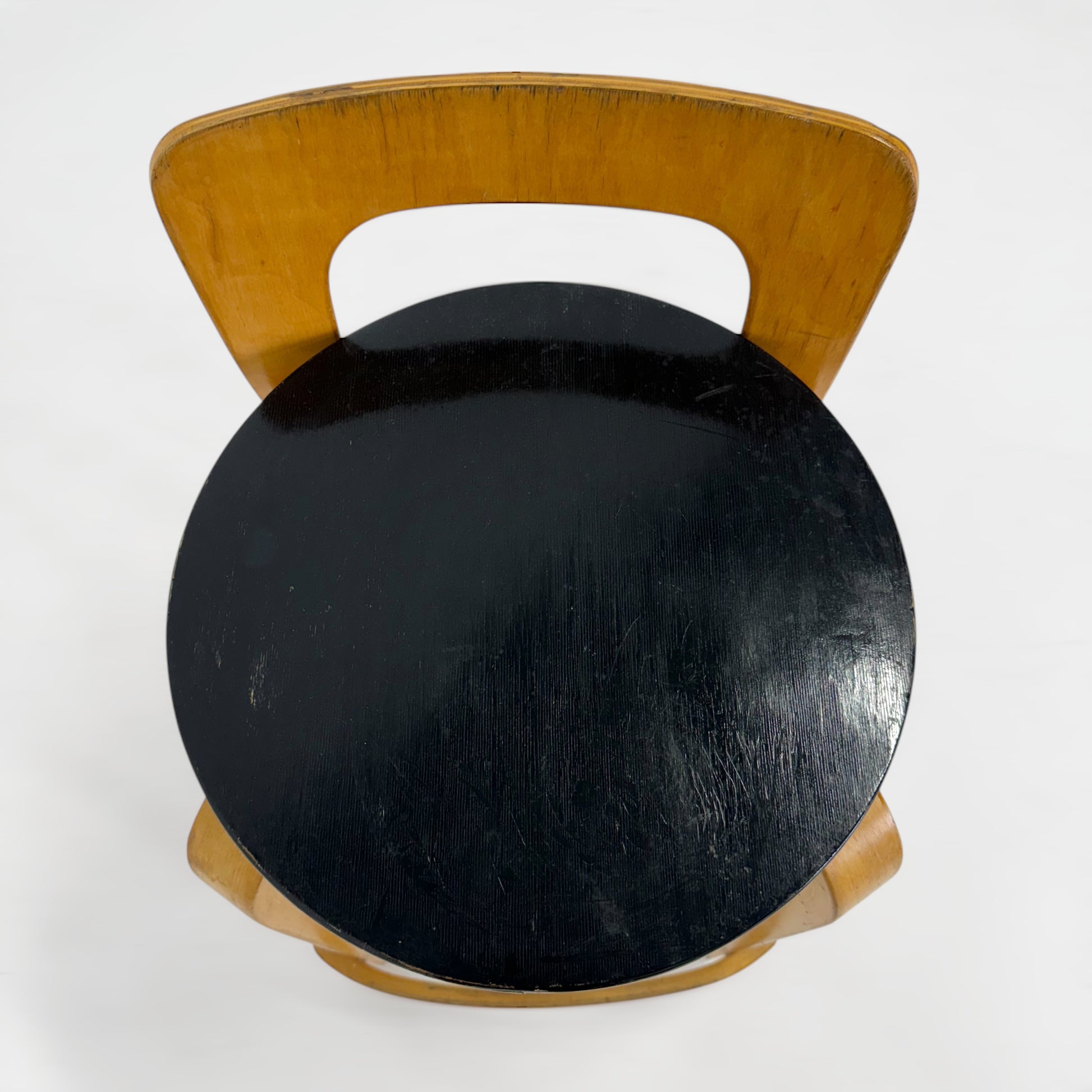 特許を取ったL字型の脚は、無垢のバーチ材を曲げるための工夫と座面とのシンプルな接合で、永年のロングセラーとなっています。