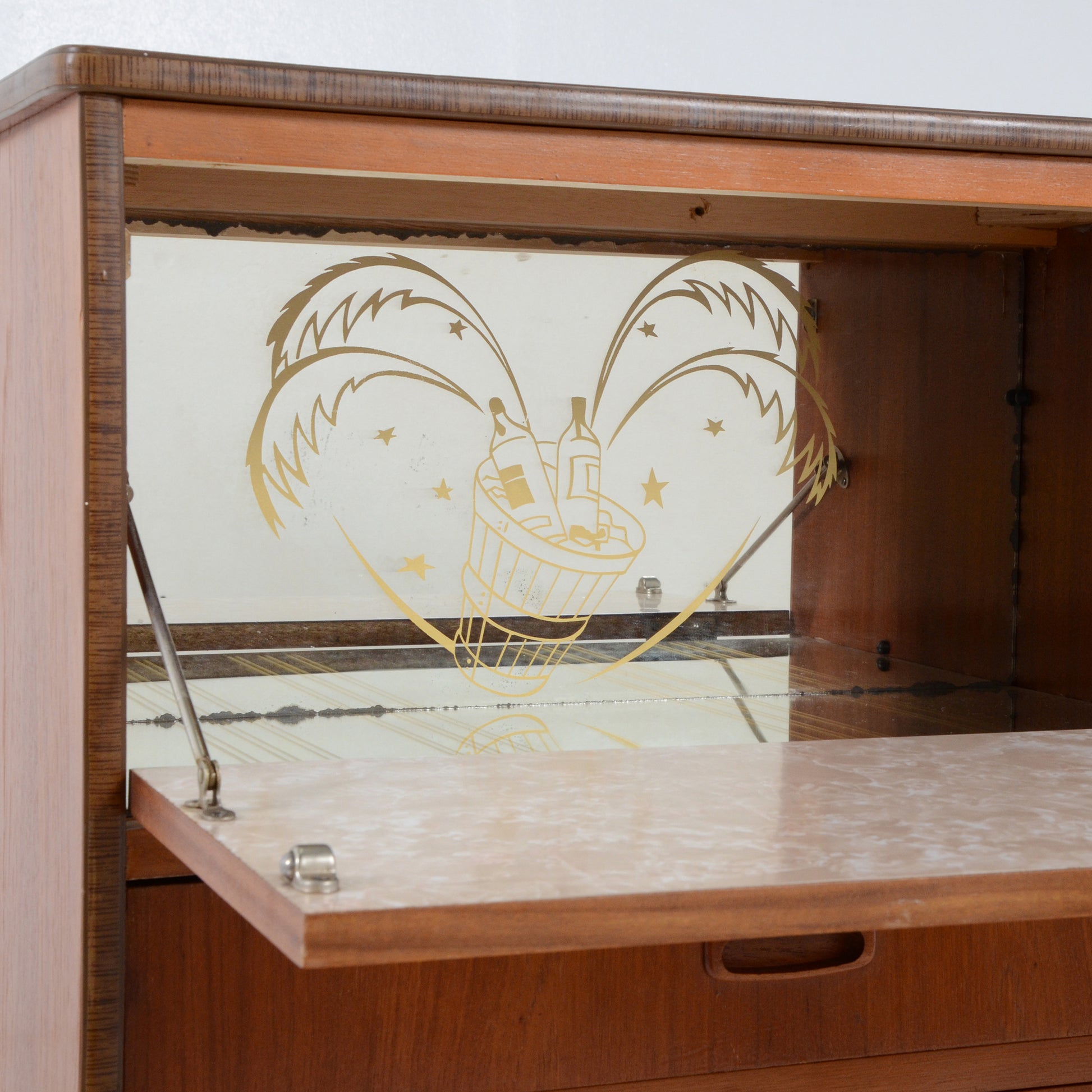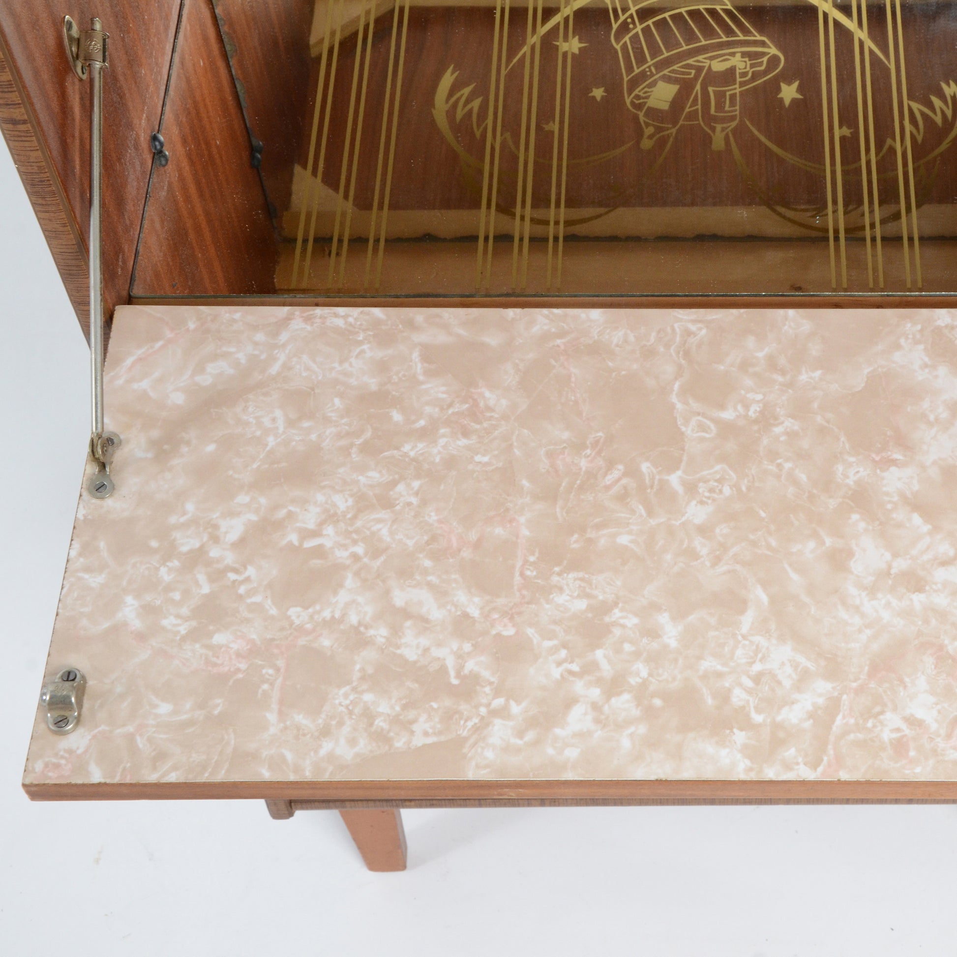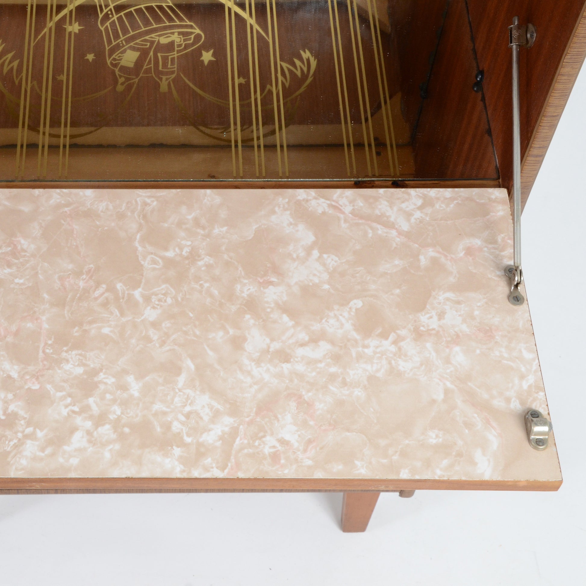 こちらのカクテルキャビネットは一見、一般的なキャビネットに見えますが、上部扉を開くとミラーにゴールドのエッチングアートが施された華やかなバーカウンターが現れます。