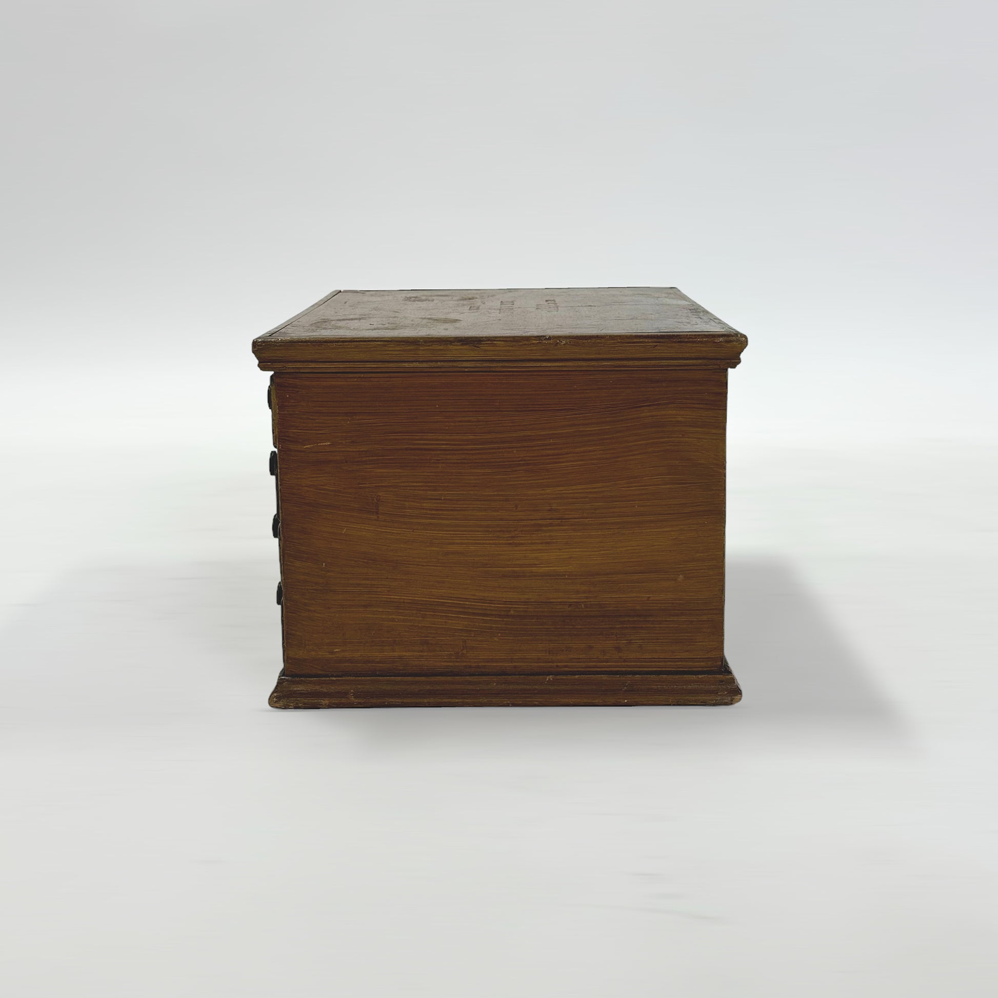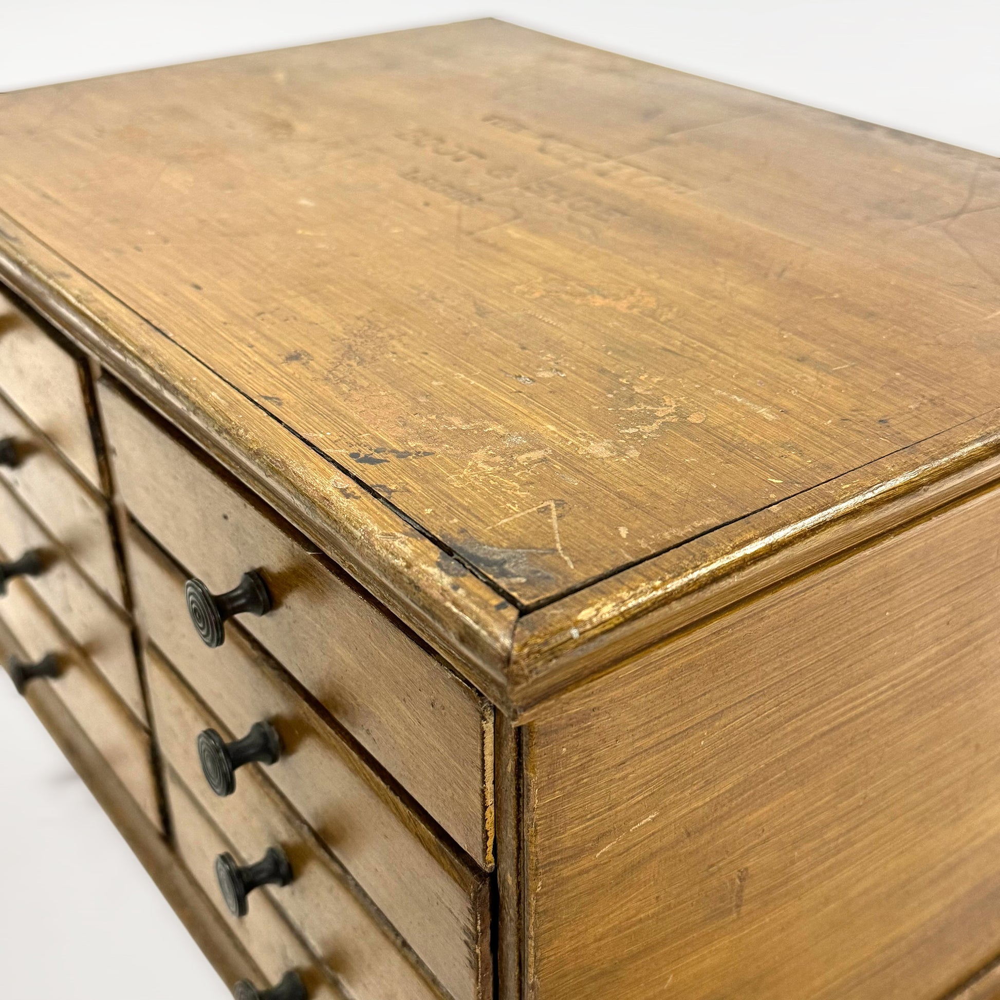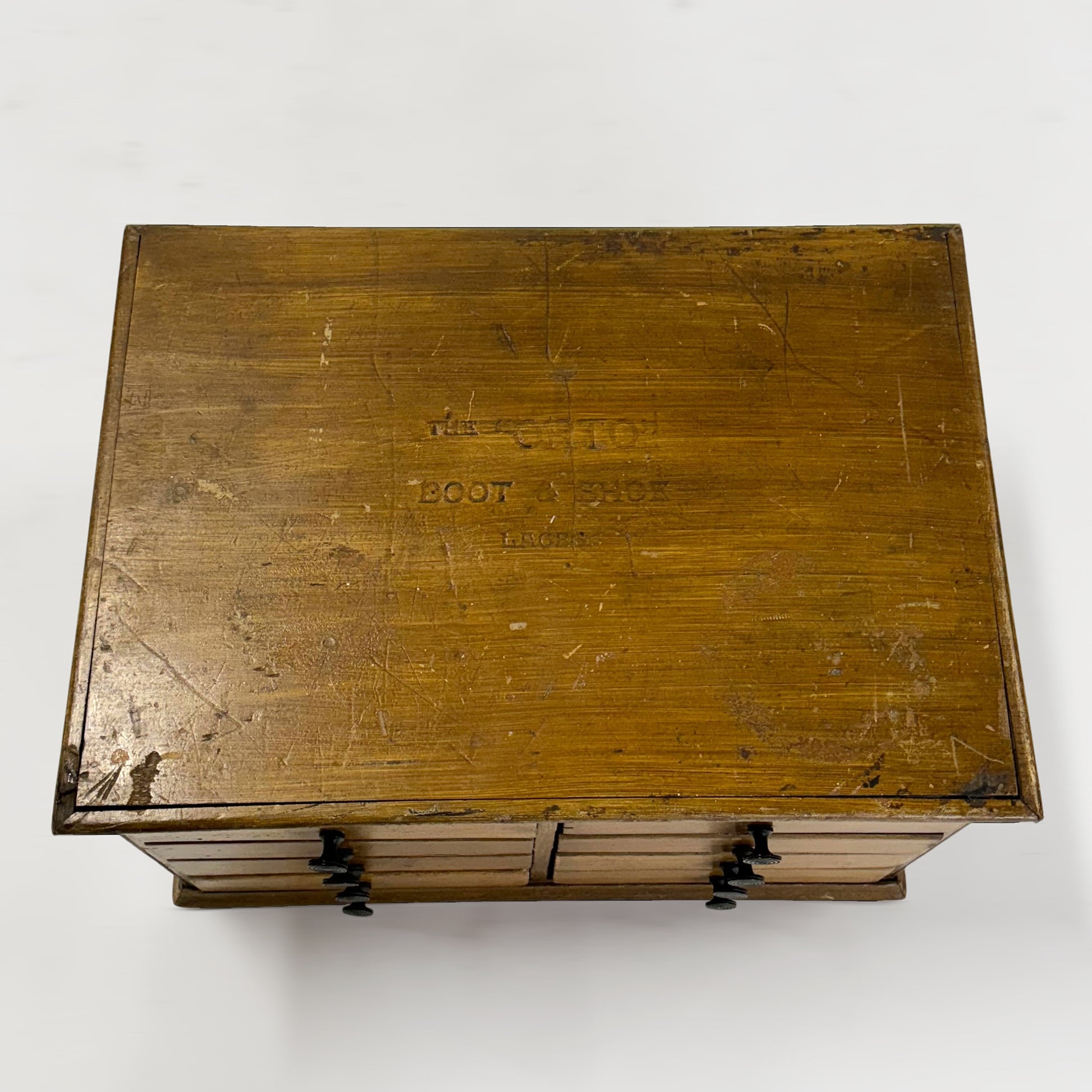 ライン模様の入った取っ手や、天板の控えめながら重厚感を感じる装飾まで、とても丁寧な造り、元々は靴紐用のショップディスプレイ什器だったもの。