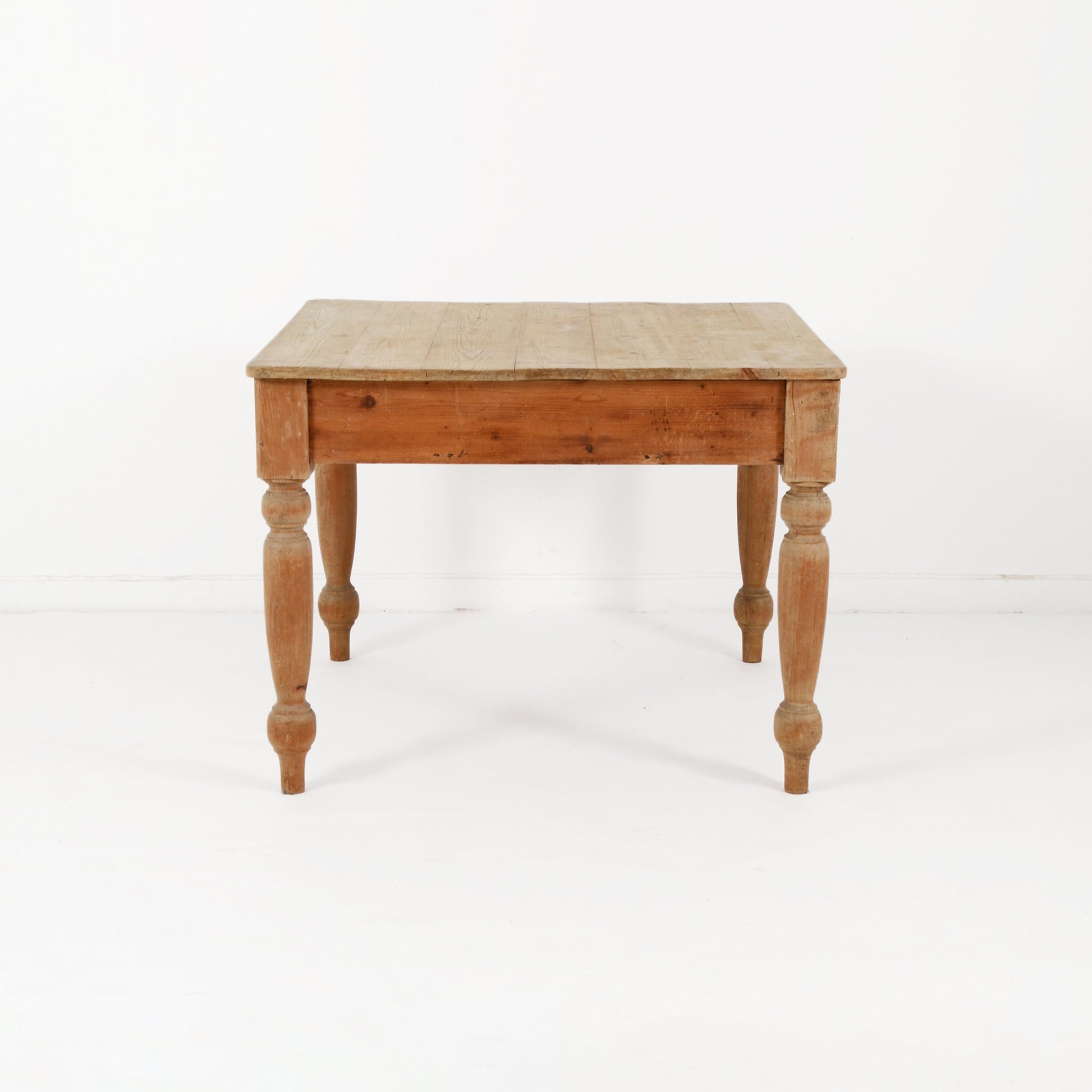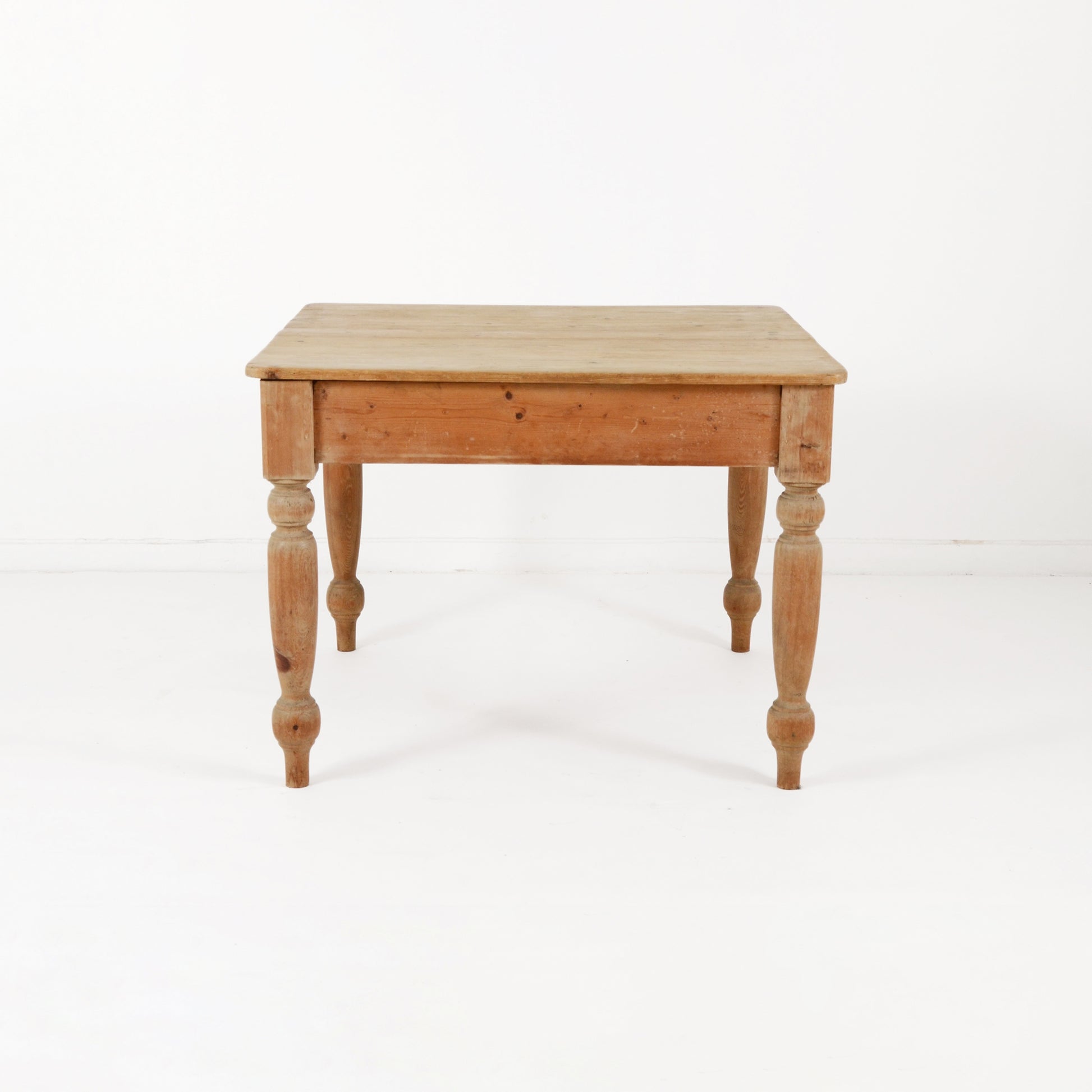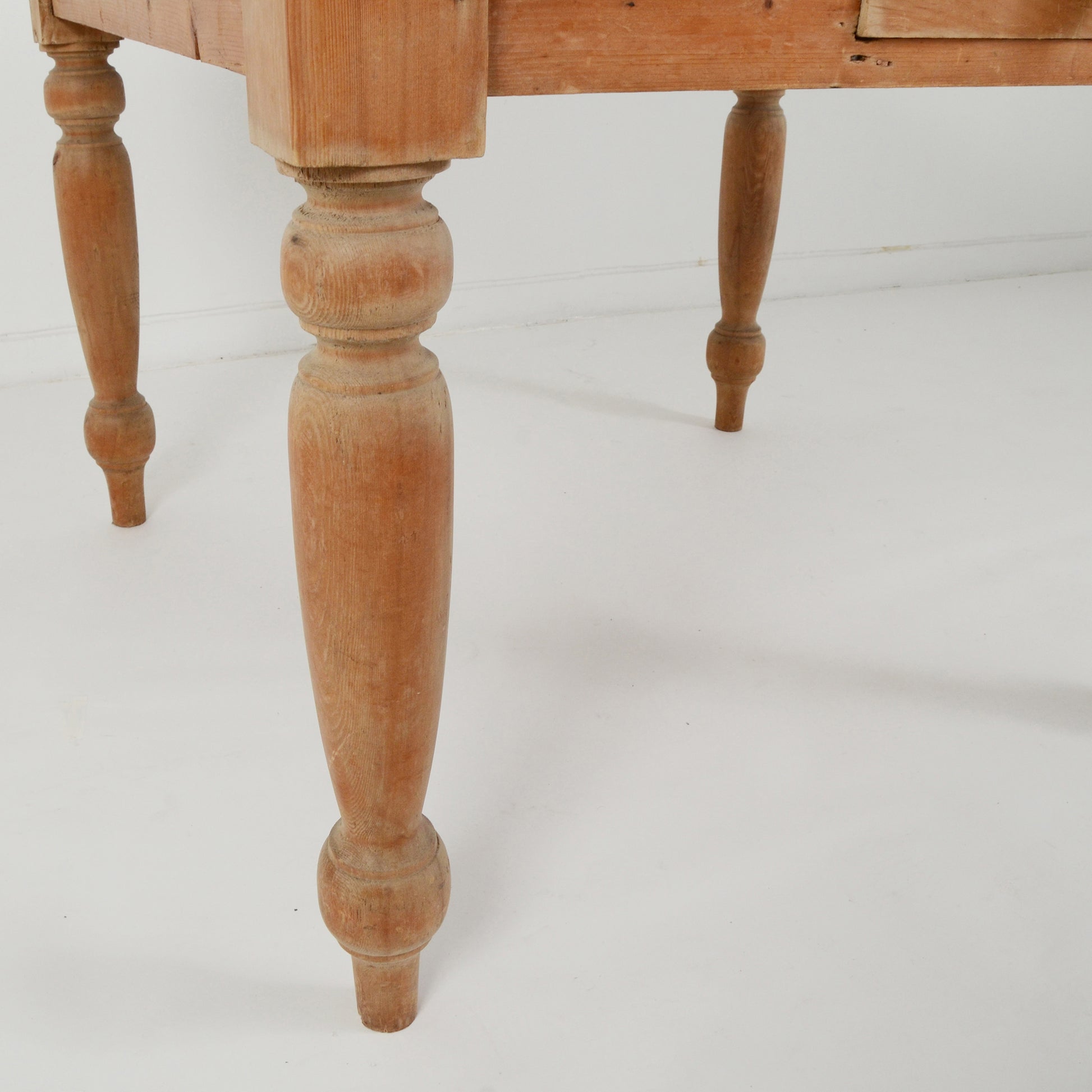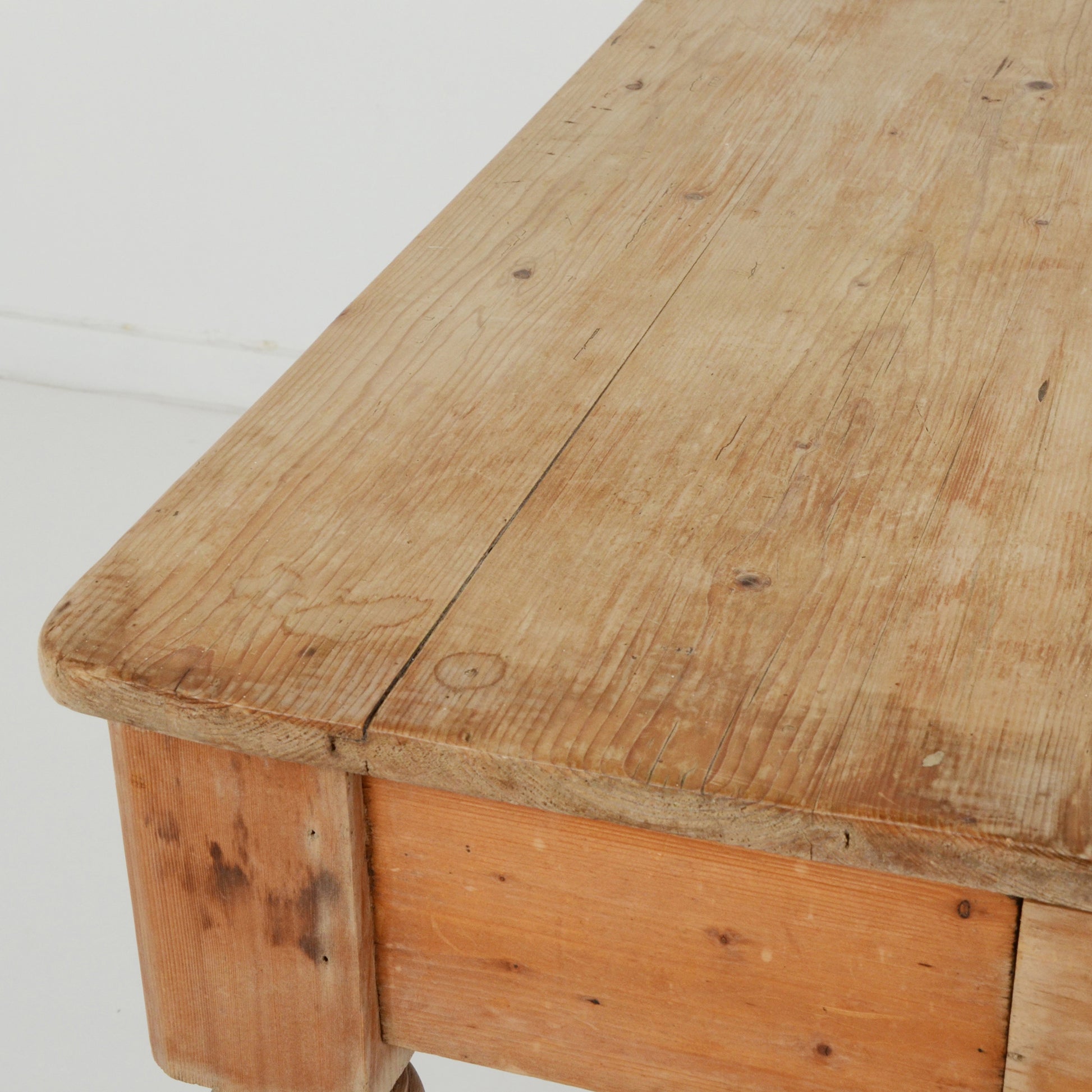 装飾が施された脚部がエレガントで、上品な表情も覗かせるシャビーシックなカントリースタイルのパイン材のテーブル。
