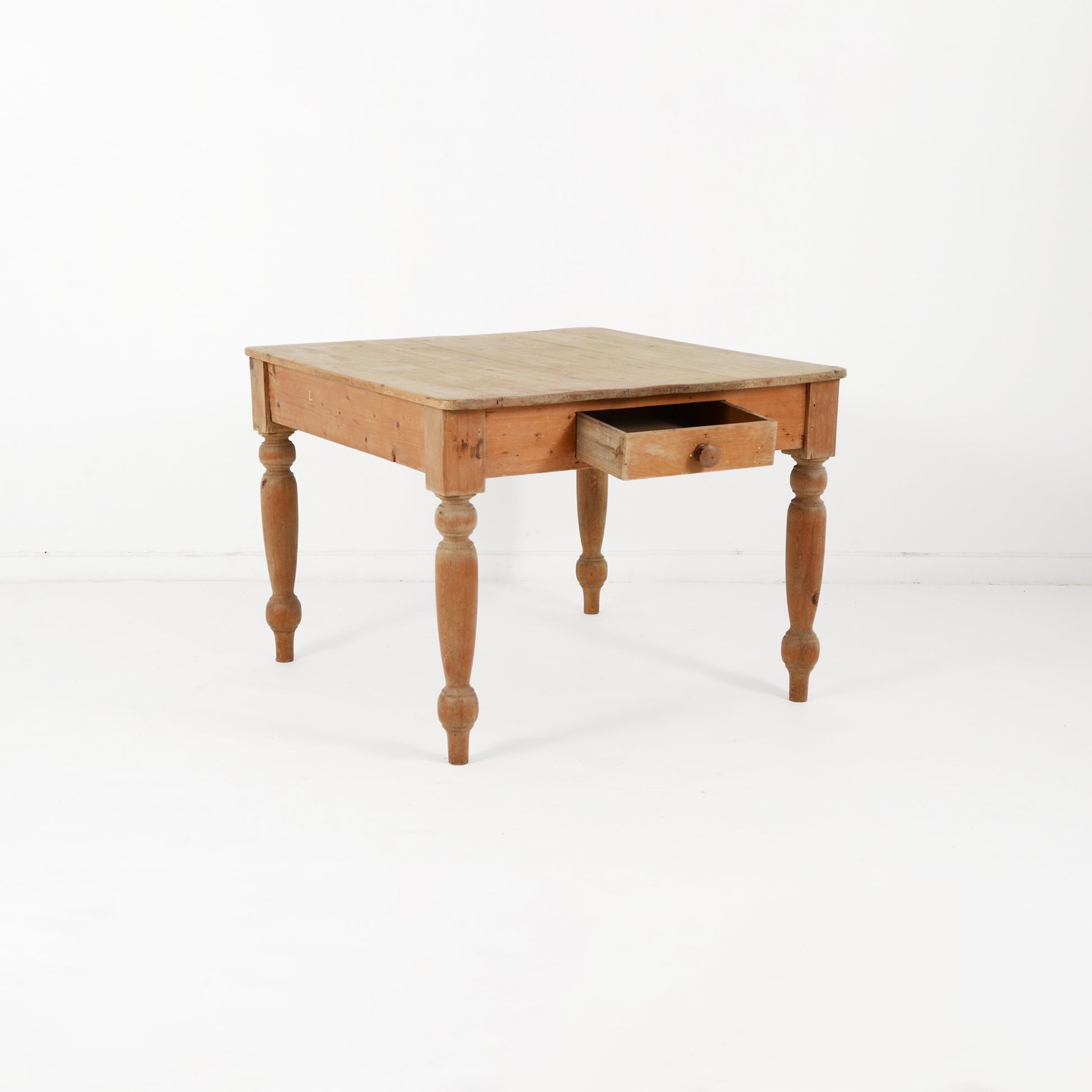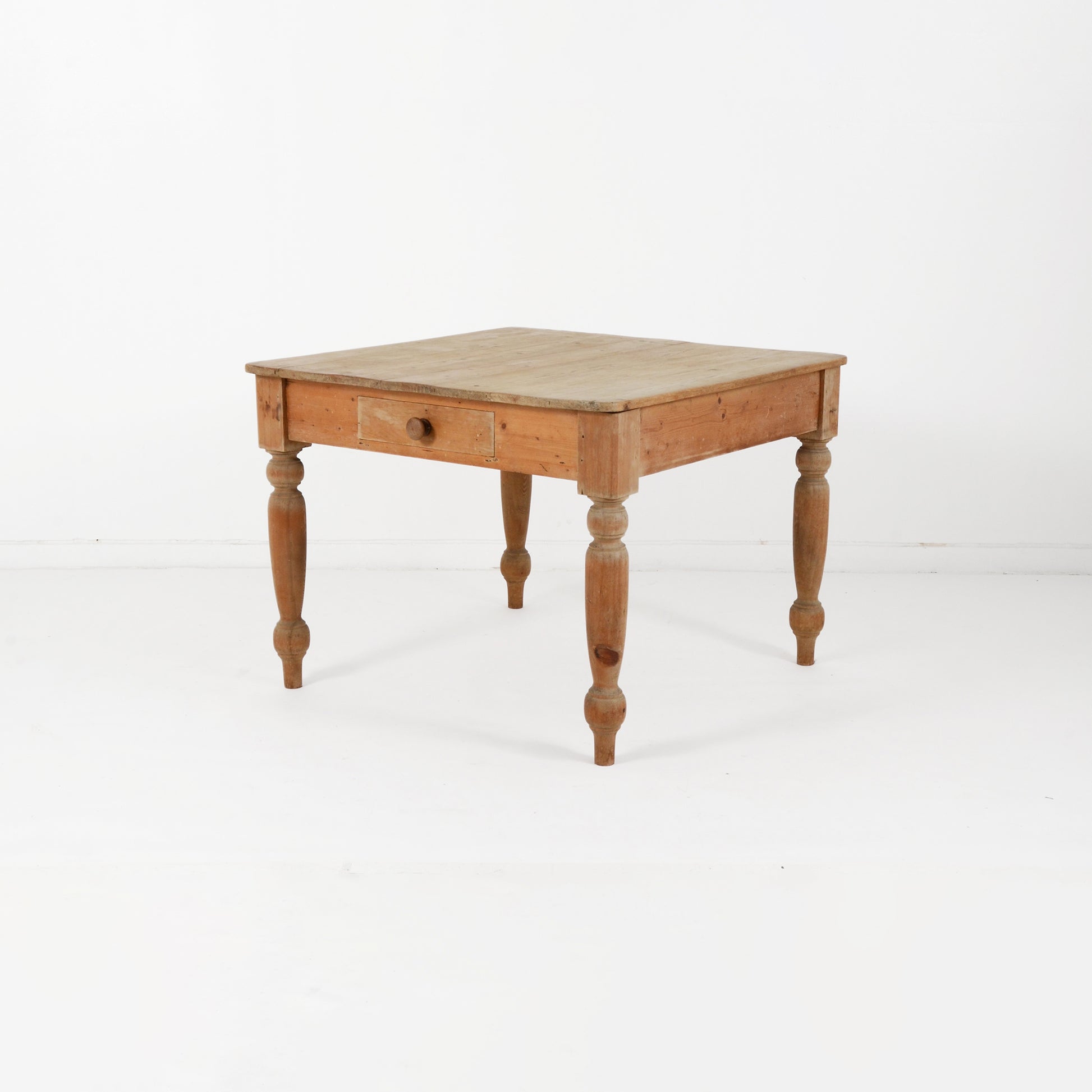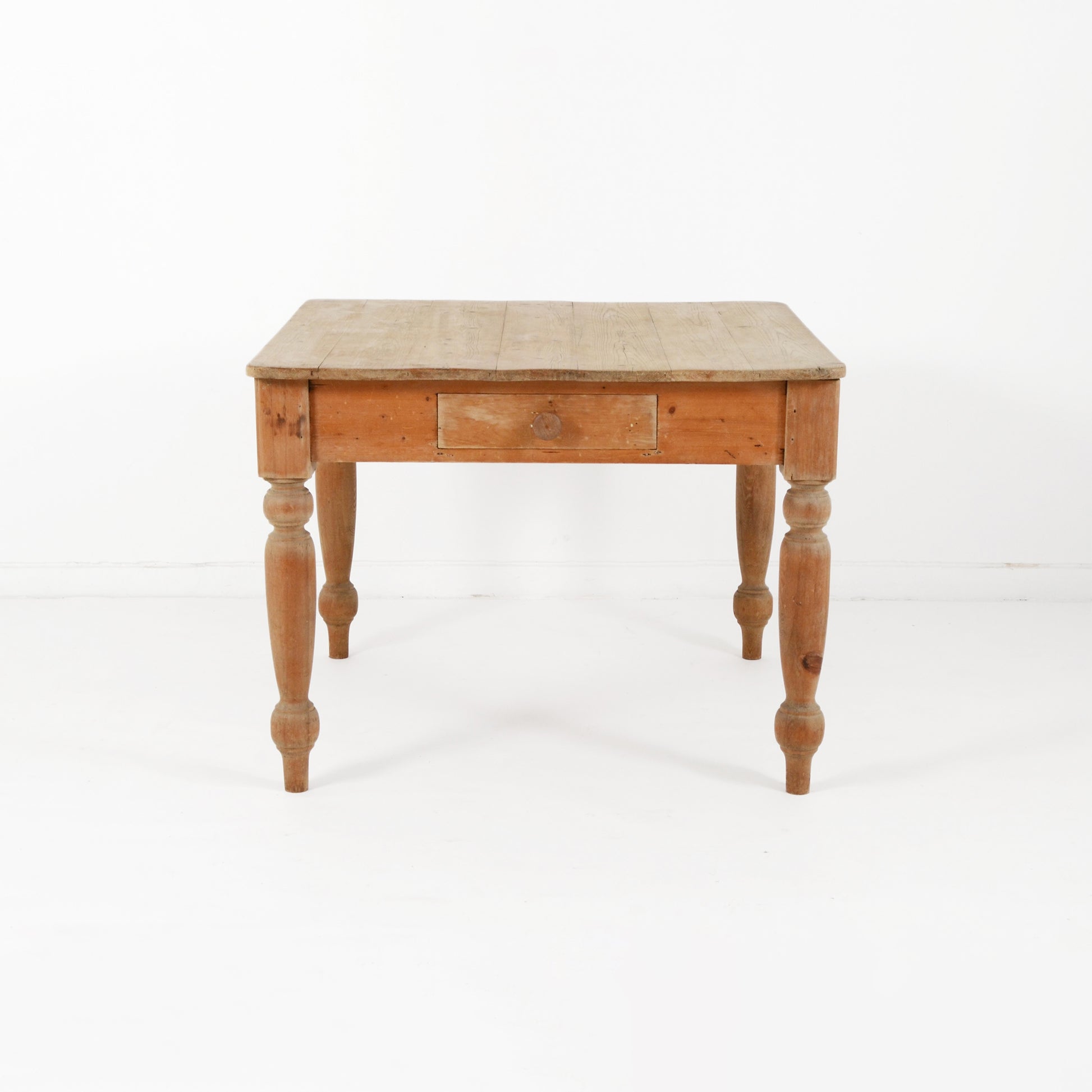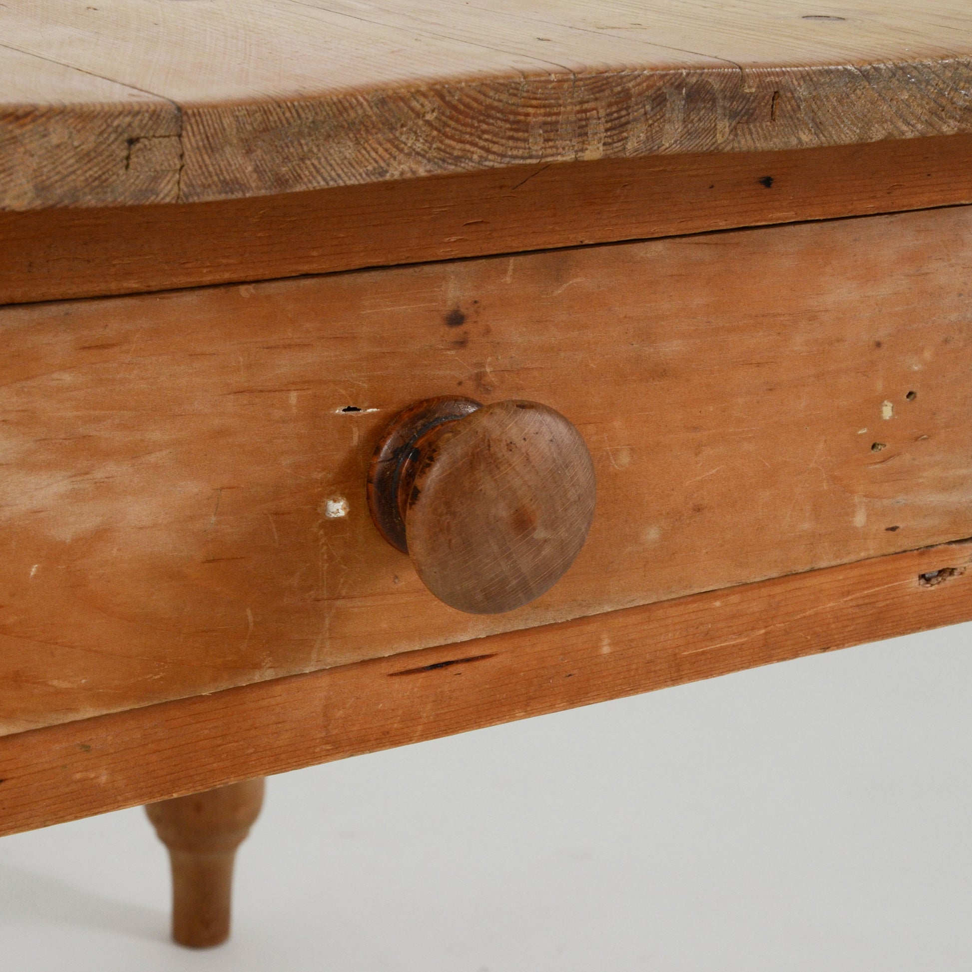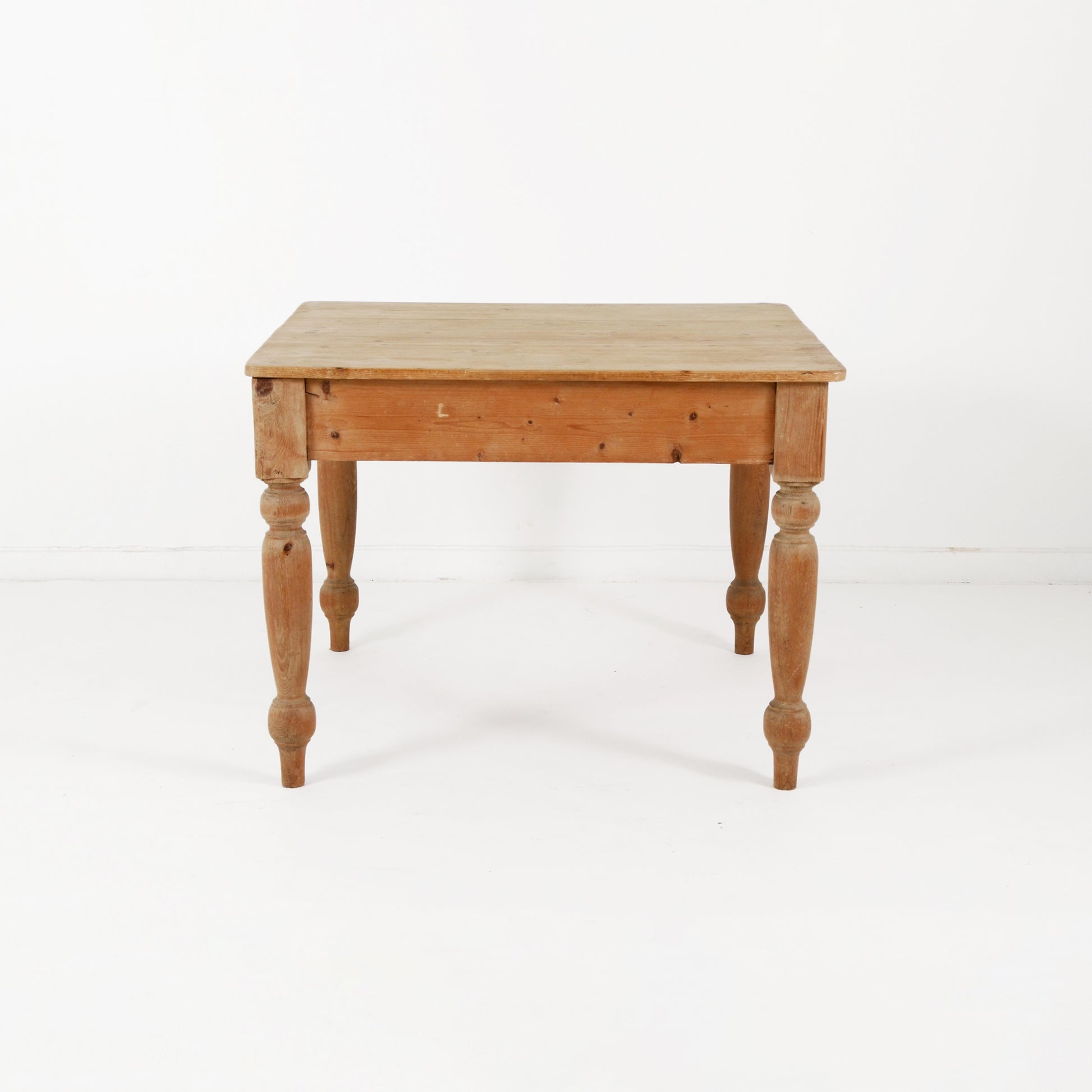 装飾が施された脚部がエレガントで、上品な表情も覗かせるシャビーシックなカントリースタイルのパイン材のテーブル。