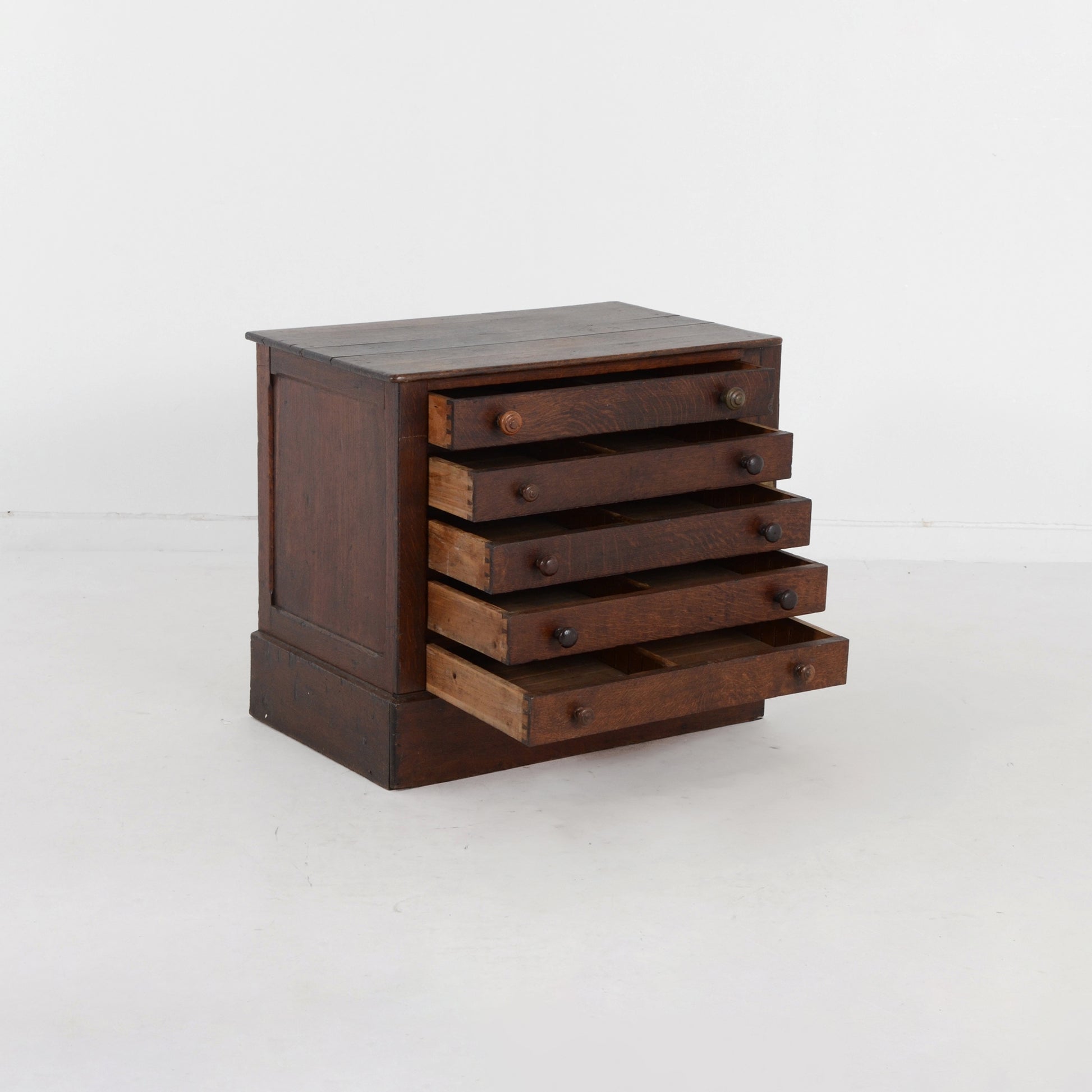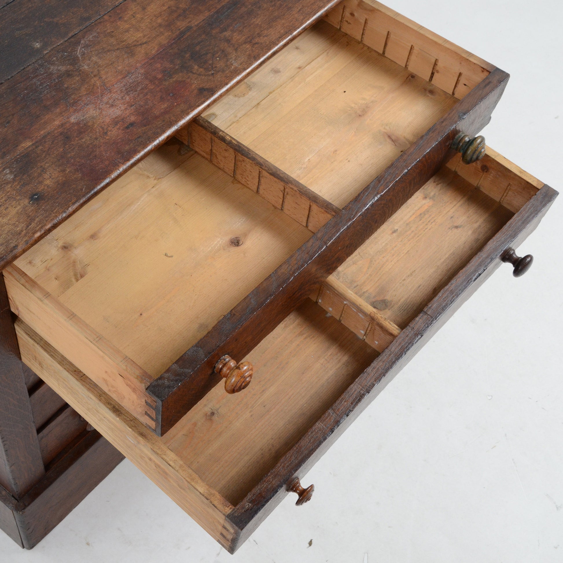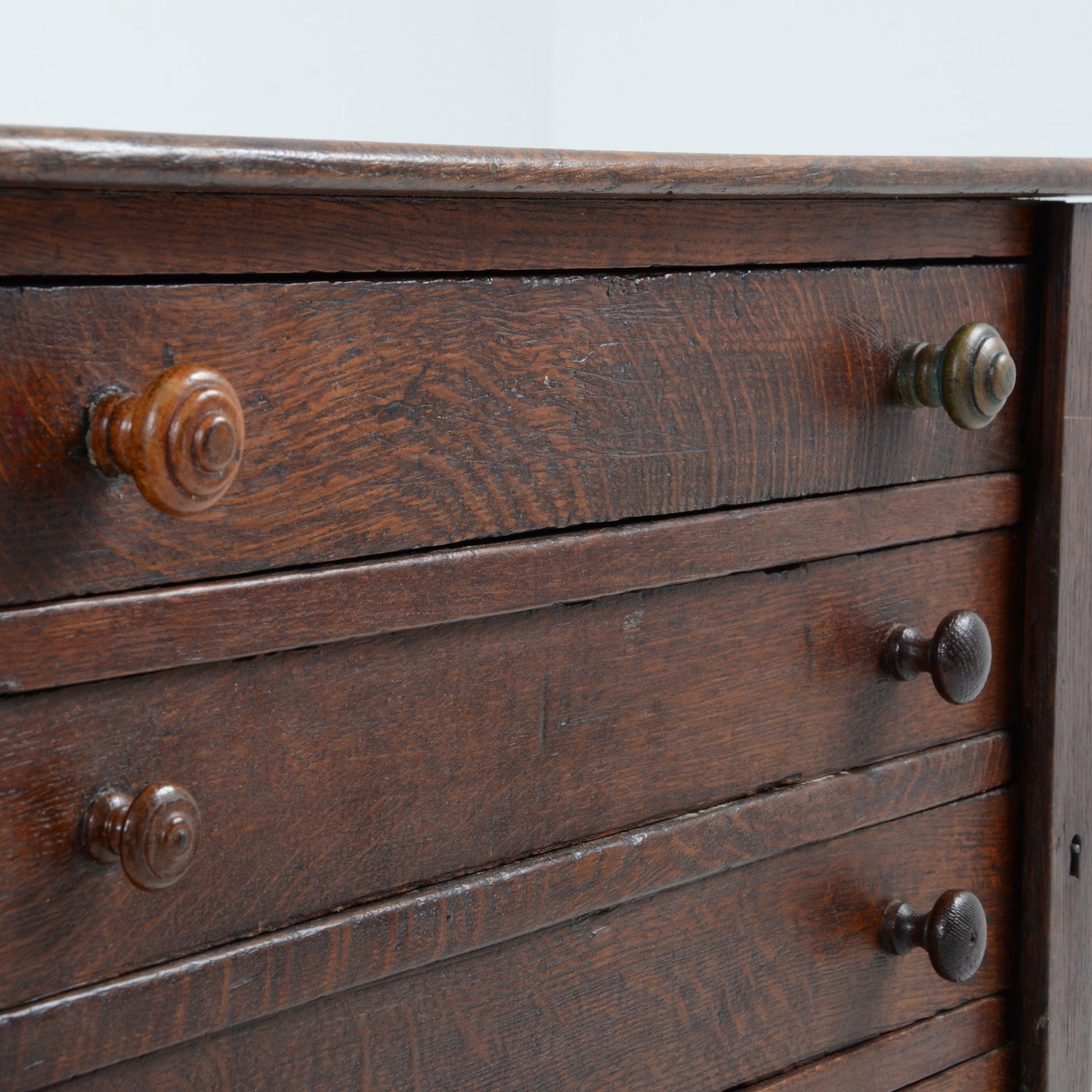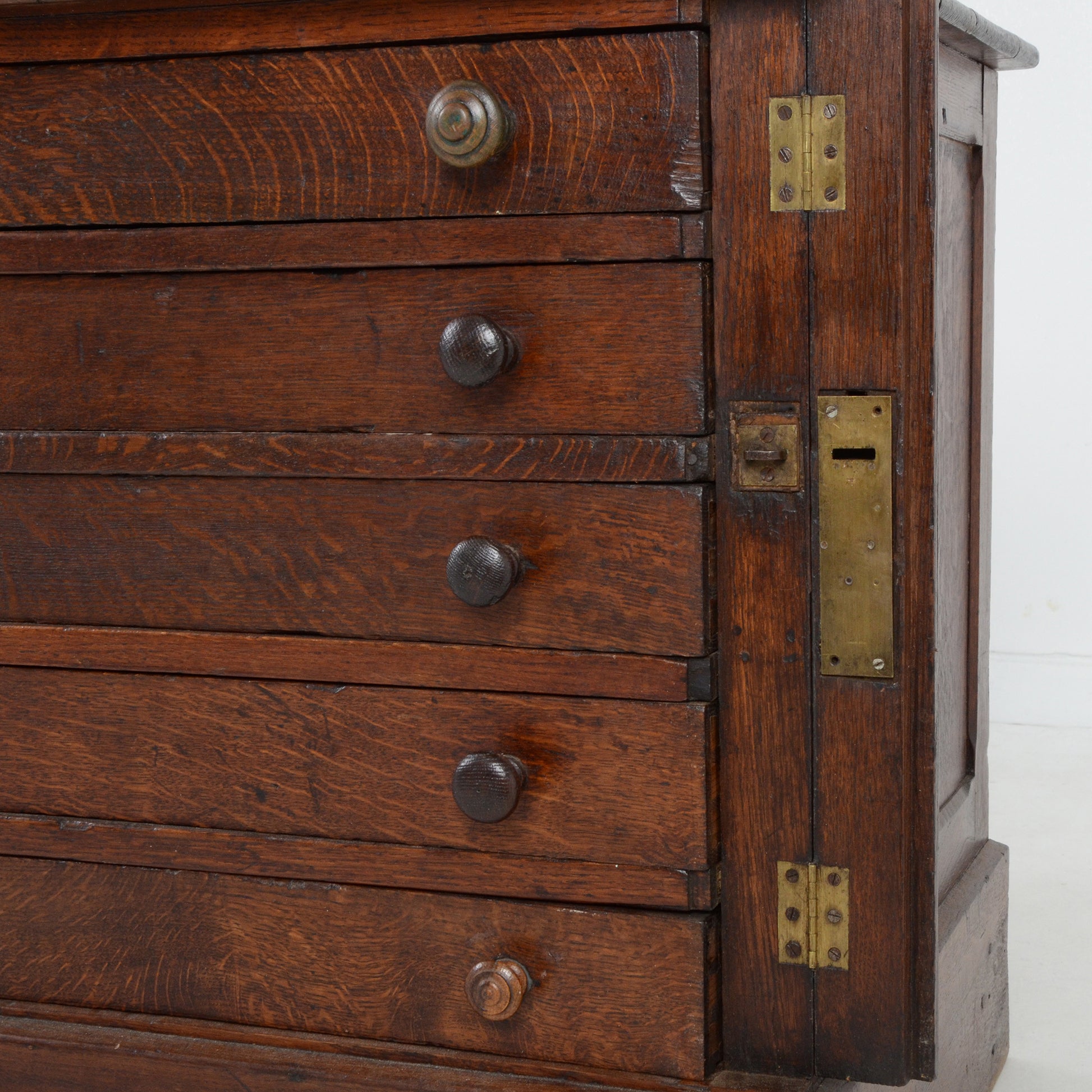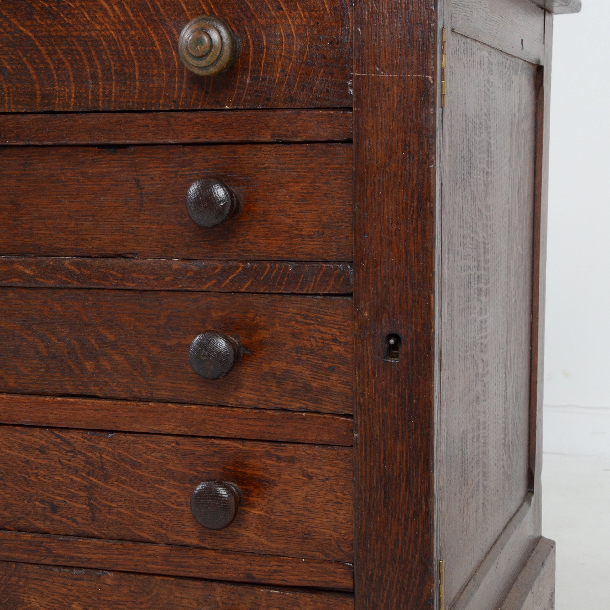 正面右の縦板部分を閉じることで全てのドロワーをロックできるような構造になっており、当時の職人技術の高さが感じられます。