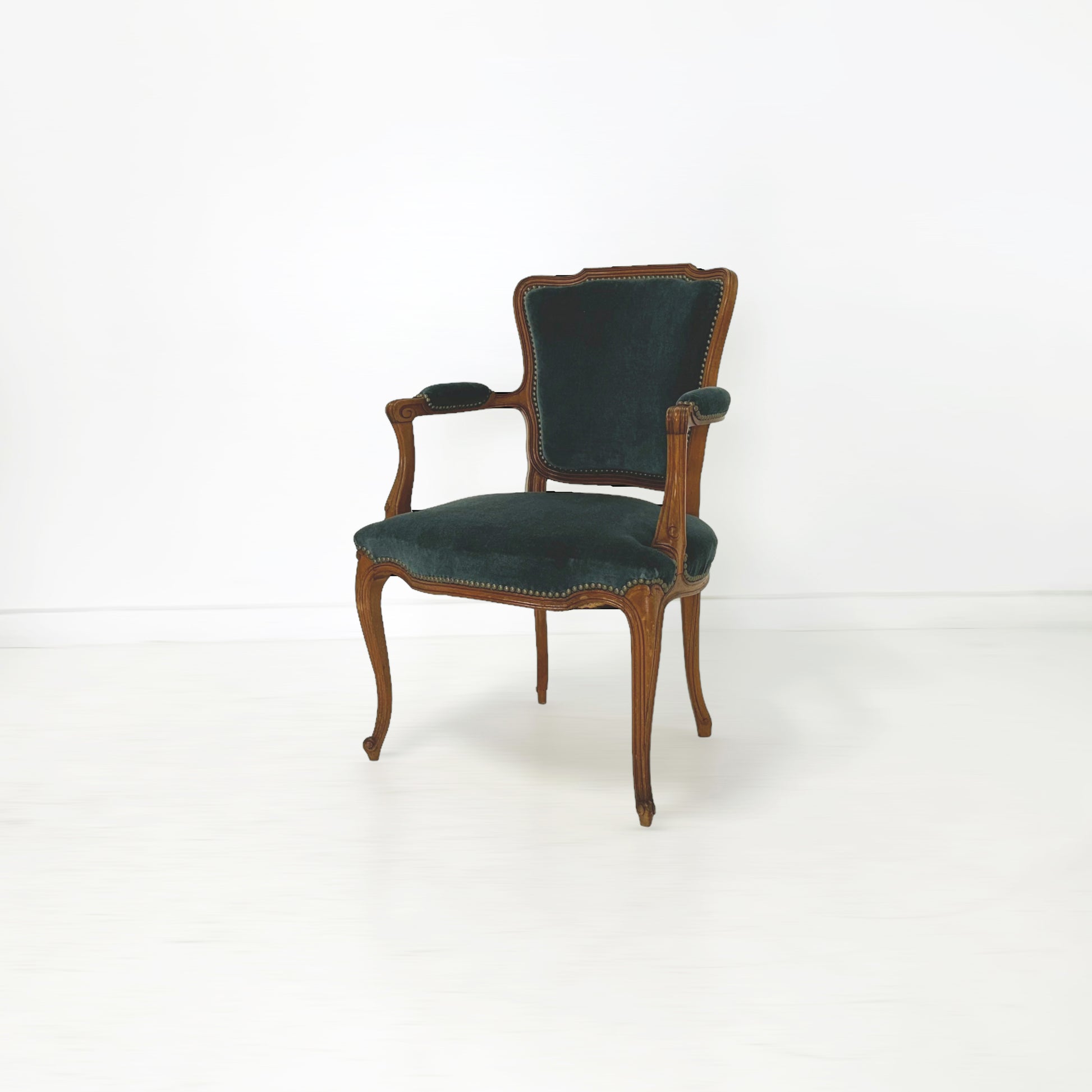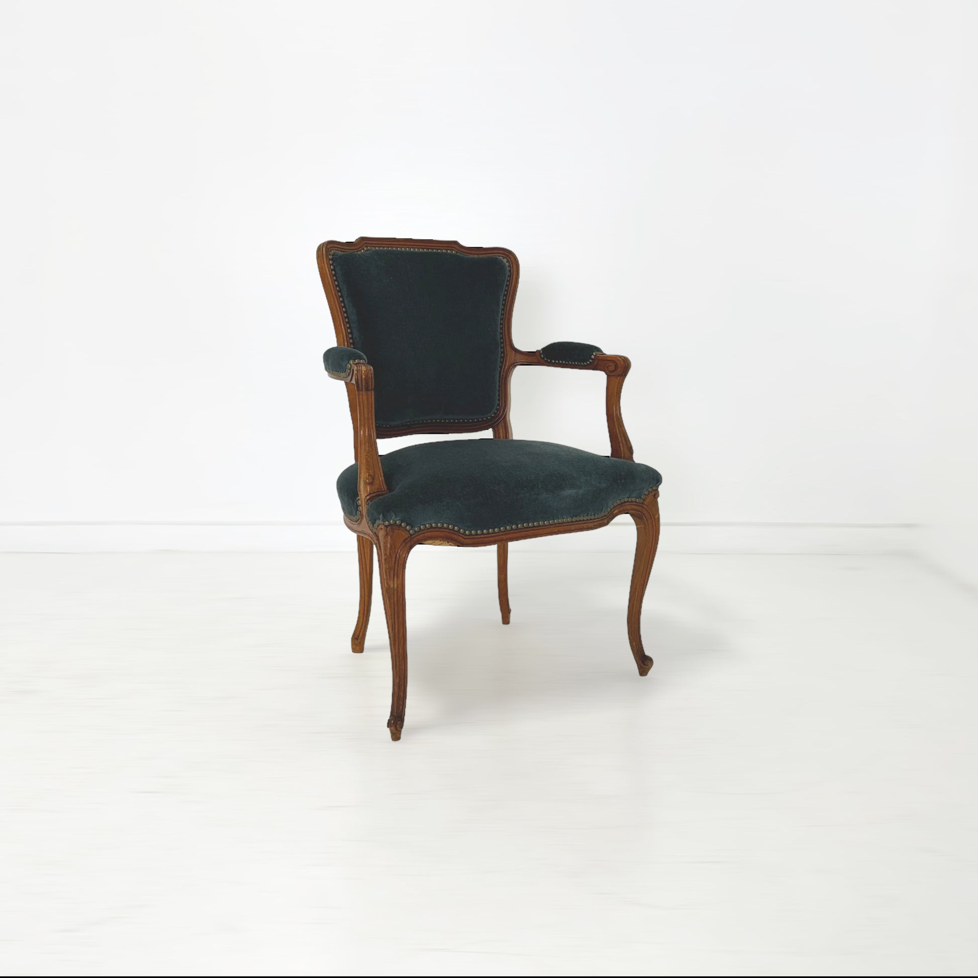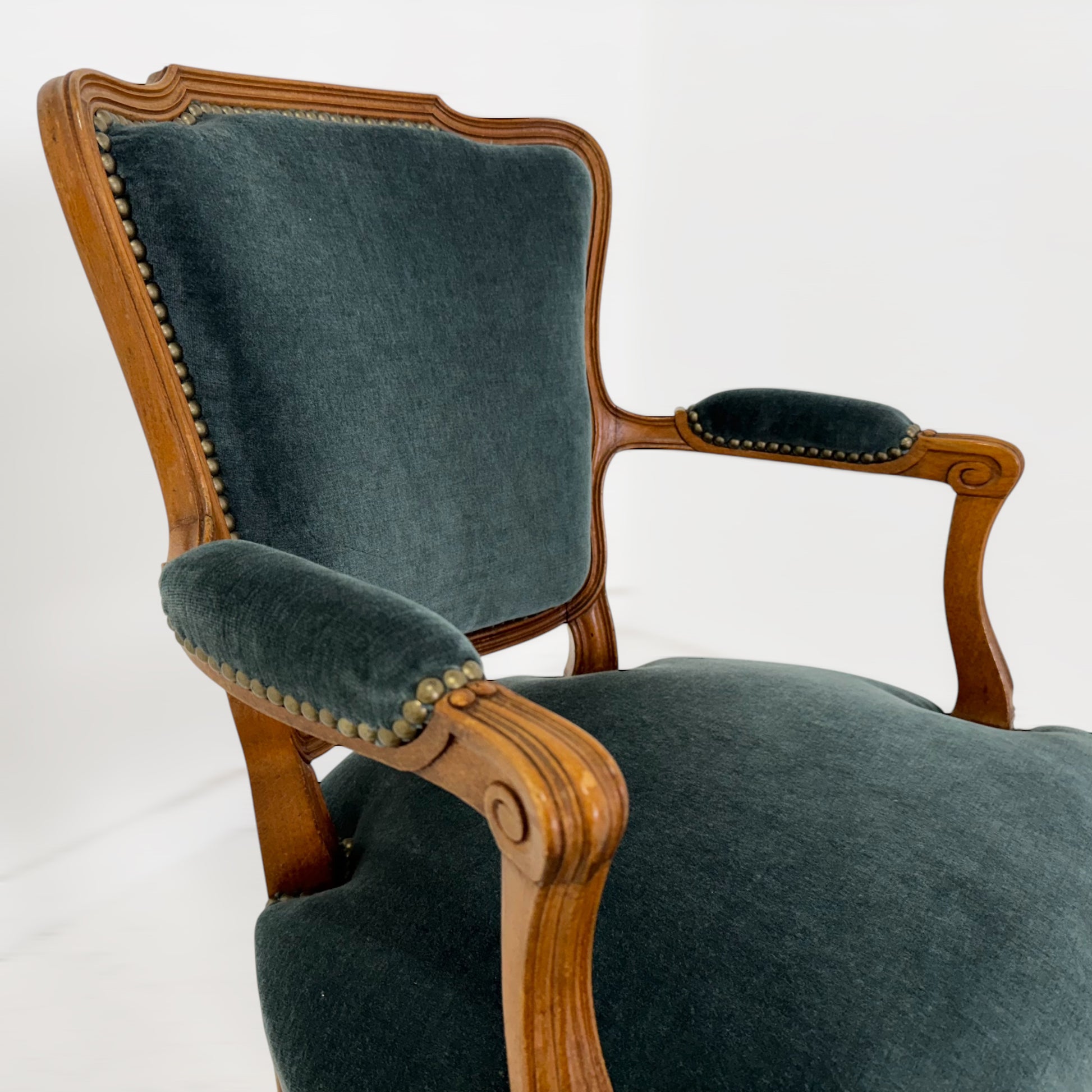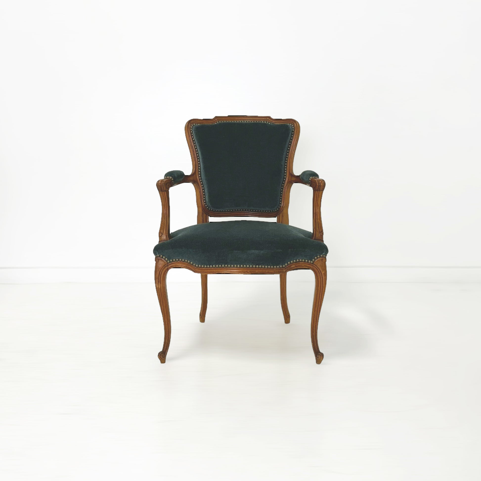 ダークカラーの張り地はベルベット調のファブリックが使用されており、ウッドの味わい深いブラウンとの相性抜群。