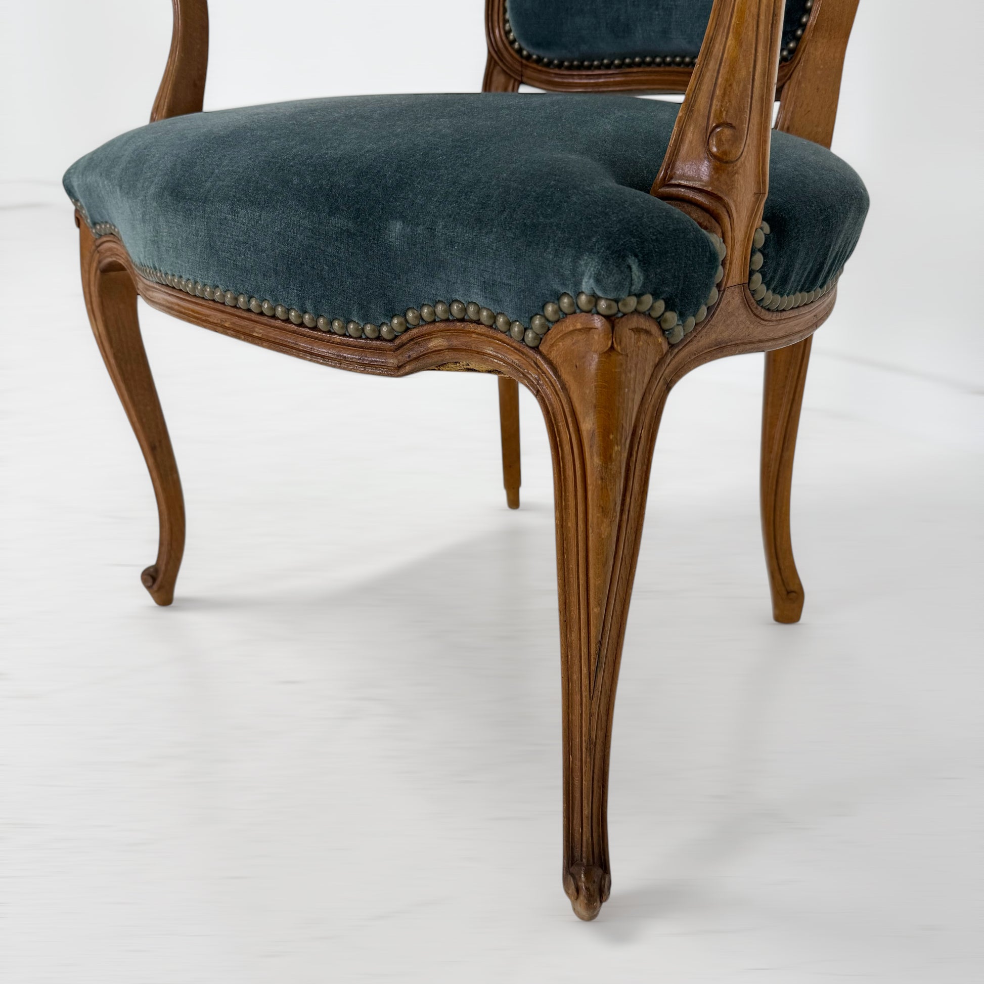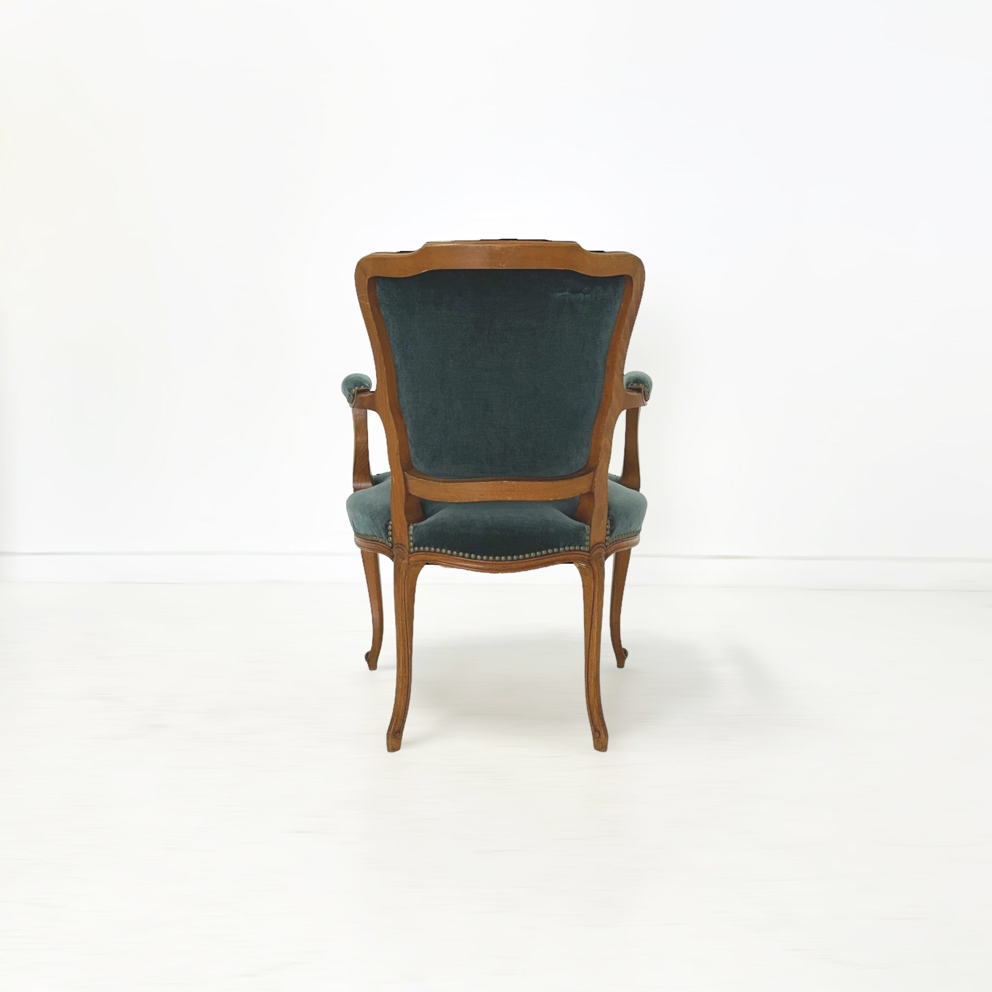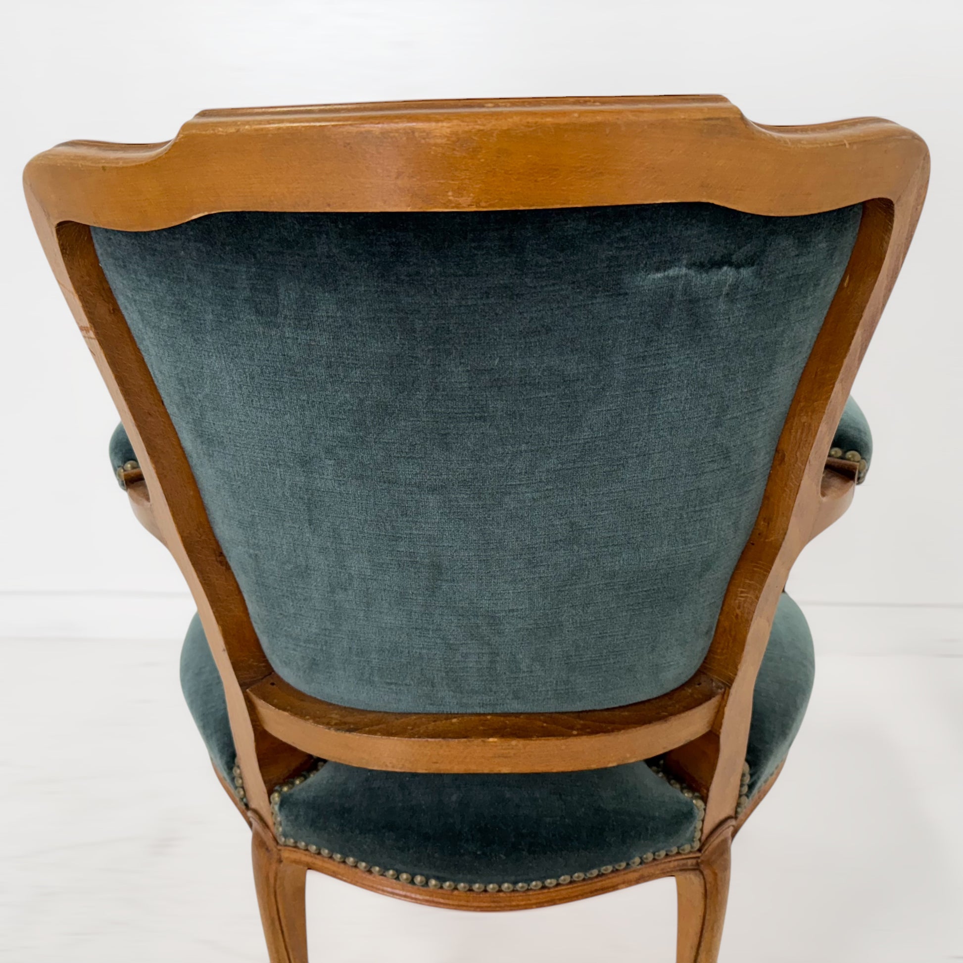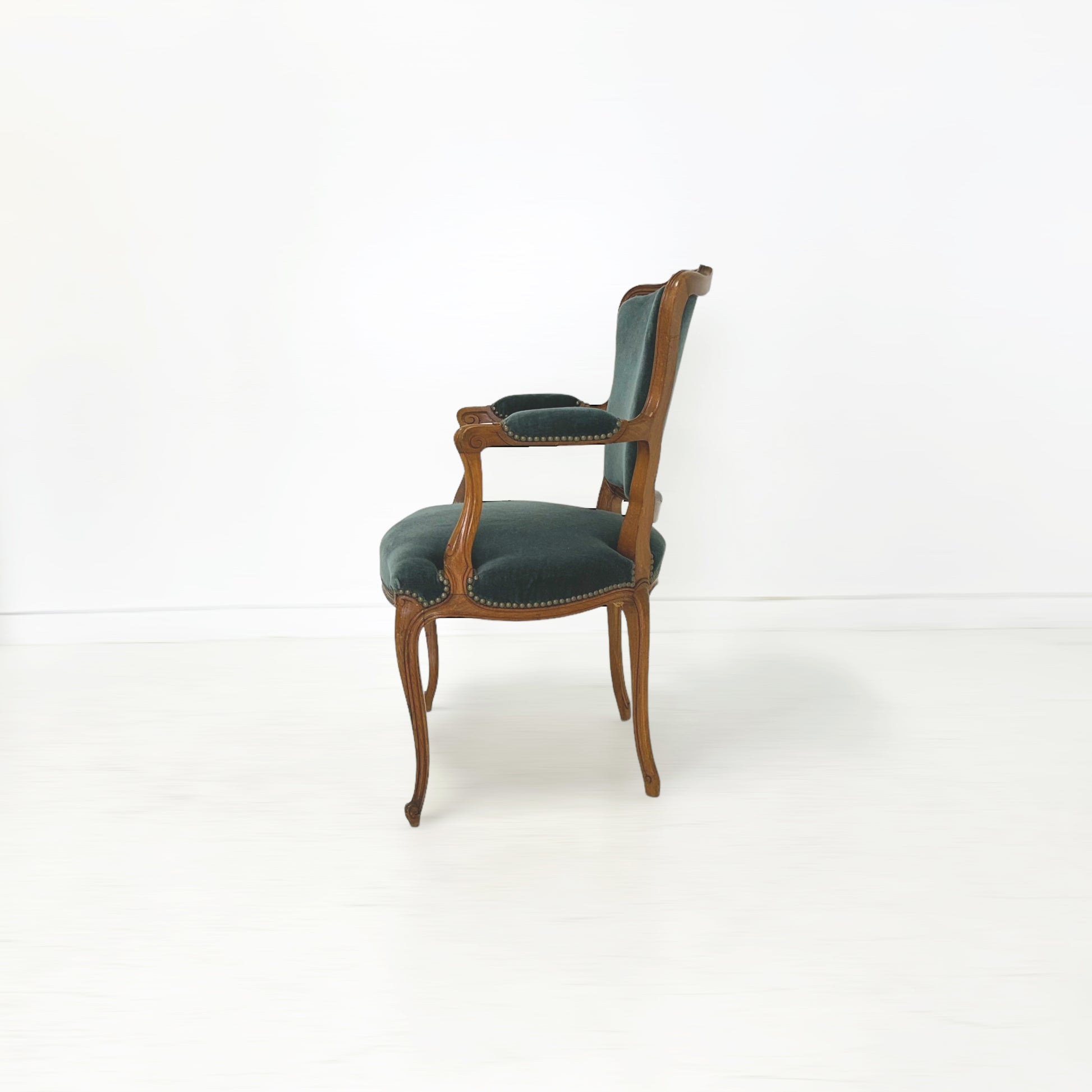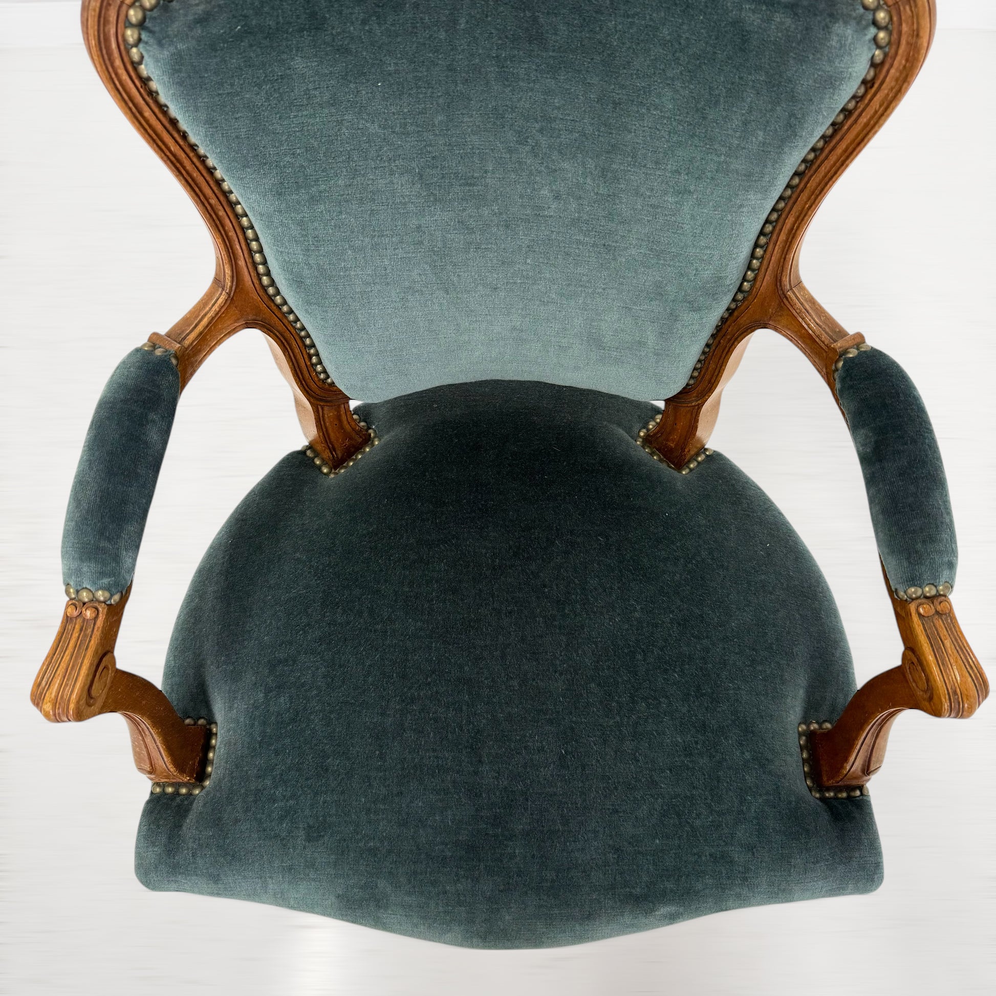 ダークカラーの張り地はベルベット調のファブリックが使用されており、ウッドの味わい深いブラウンとの相性抜群。