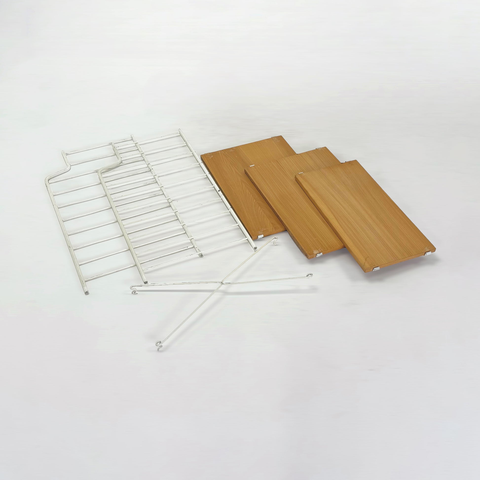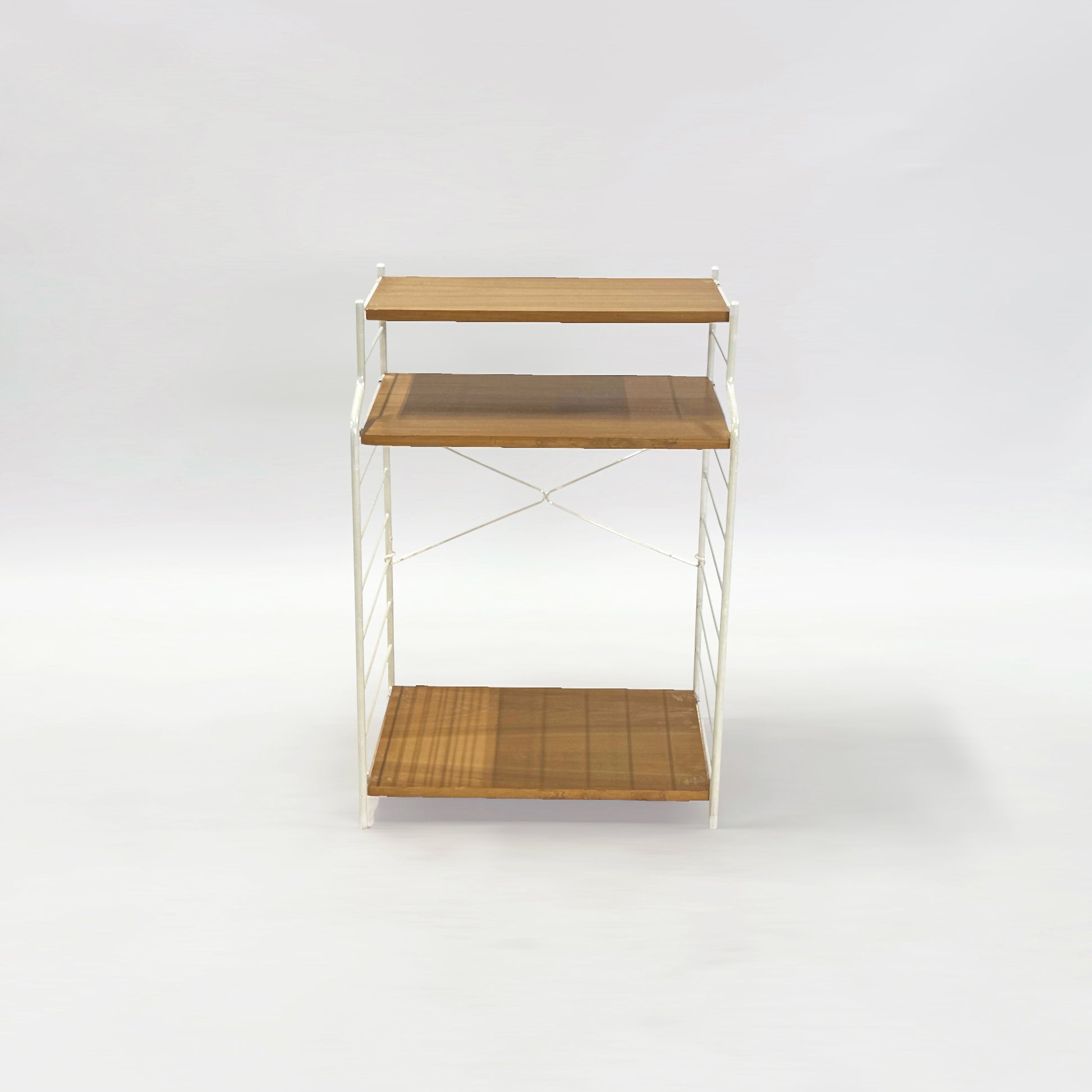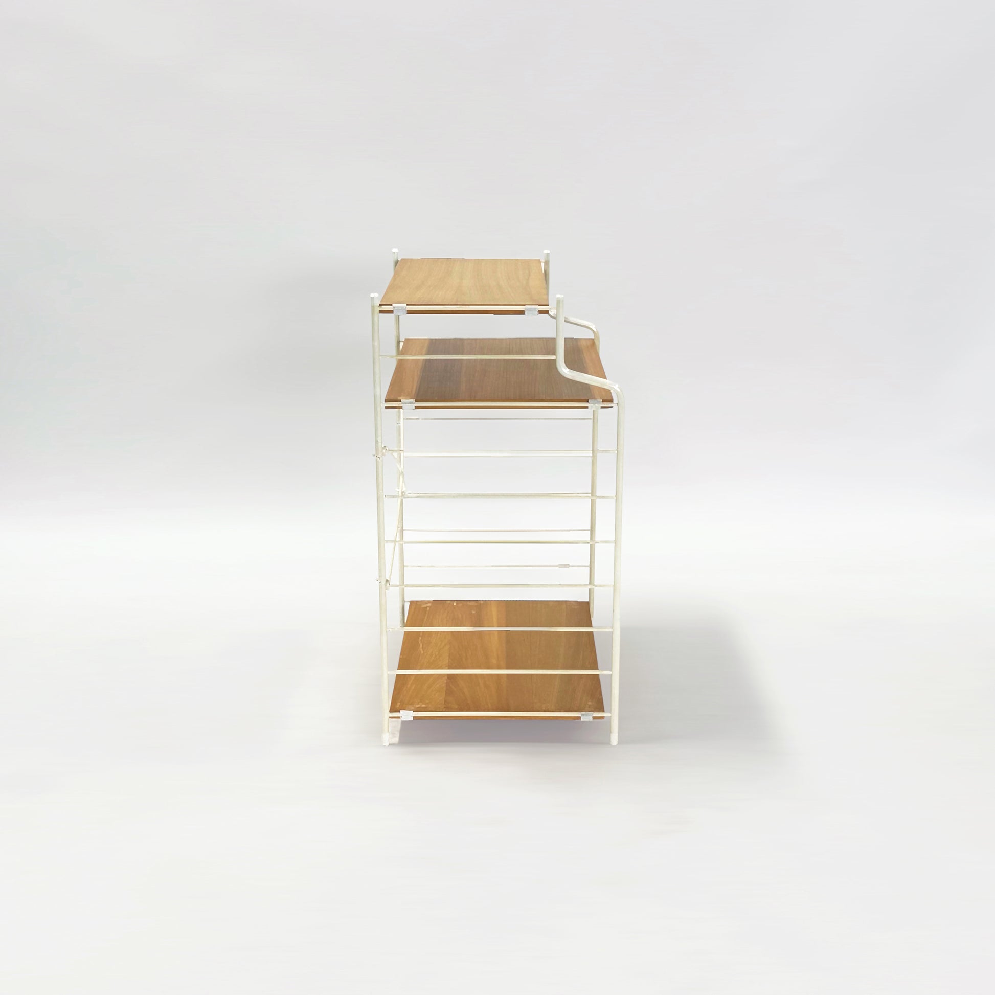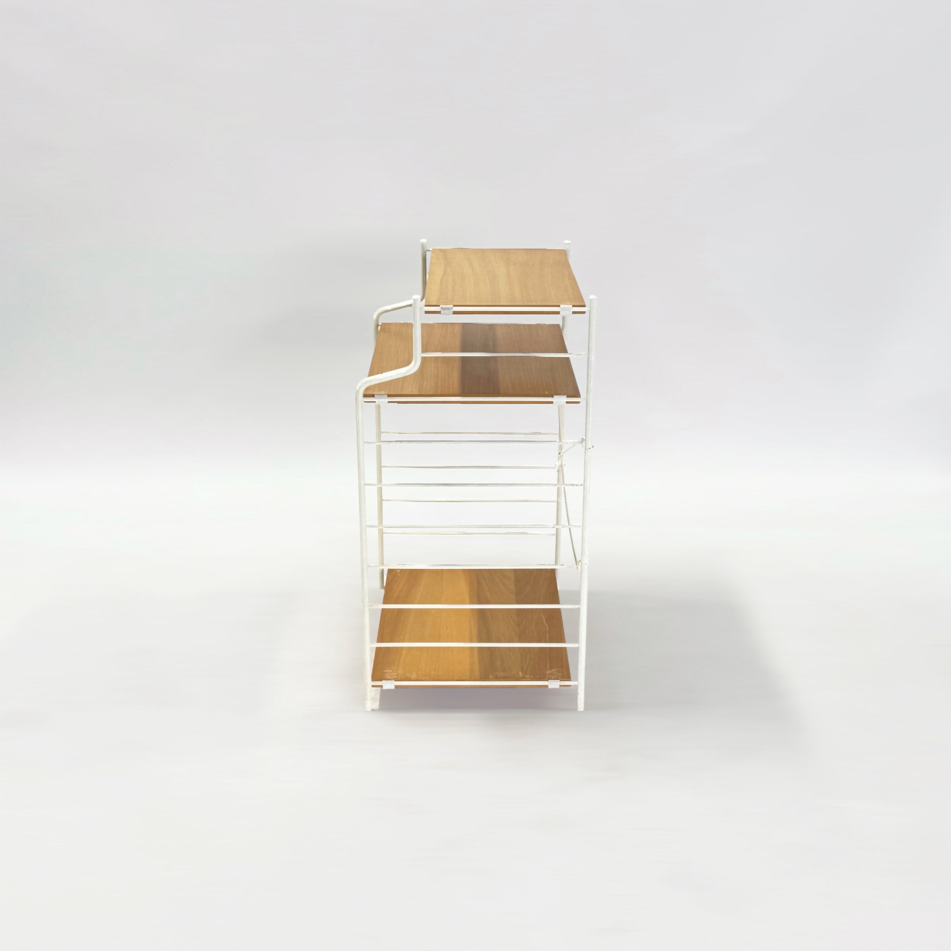 白の鉄製のフレームと木の棚板の組み合わせが可愛らしい組み立て式のユニットシェルフ。