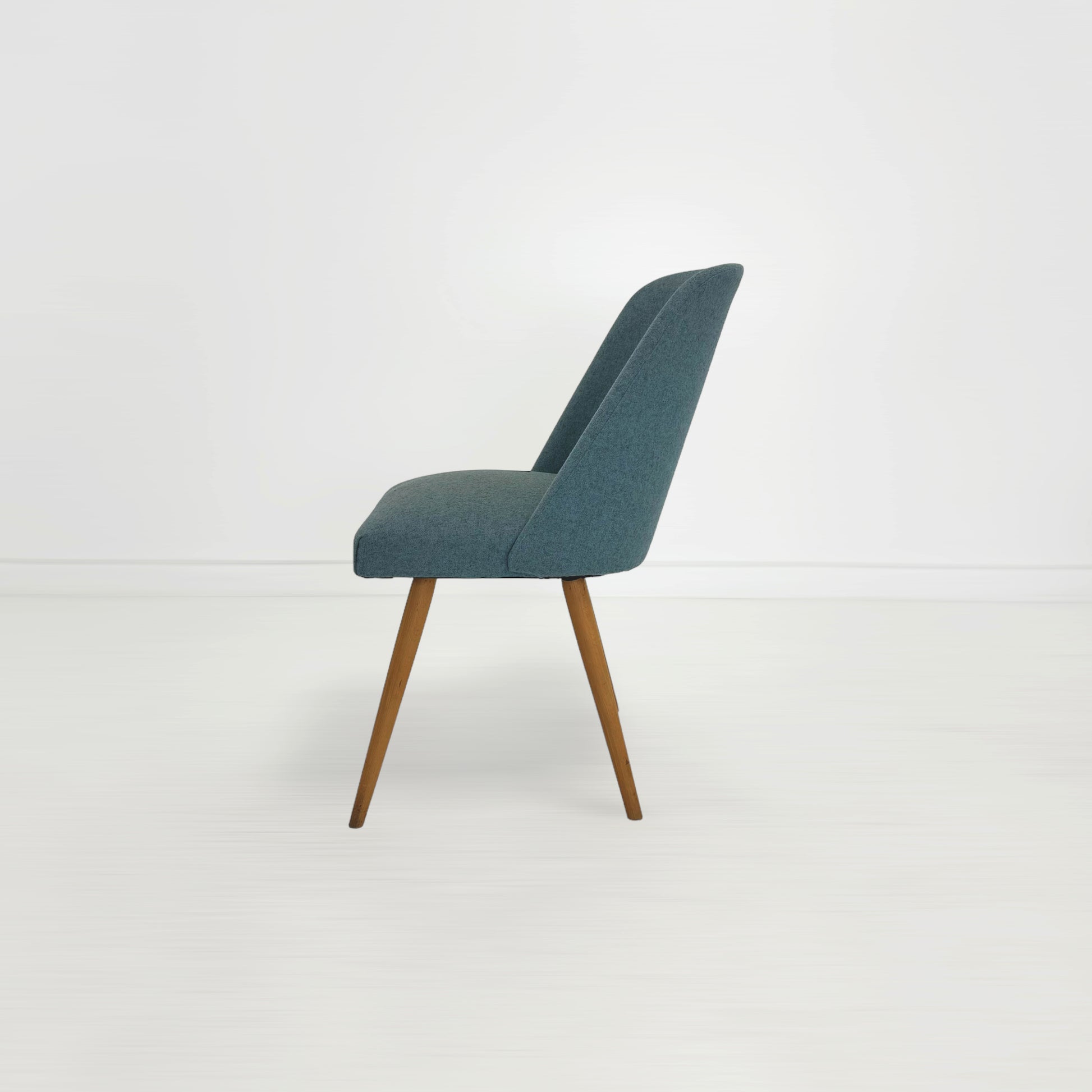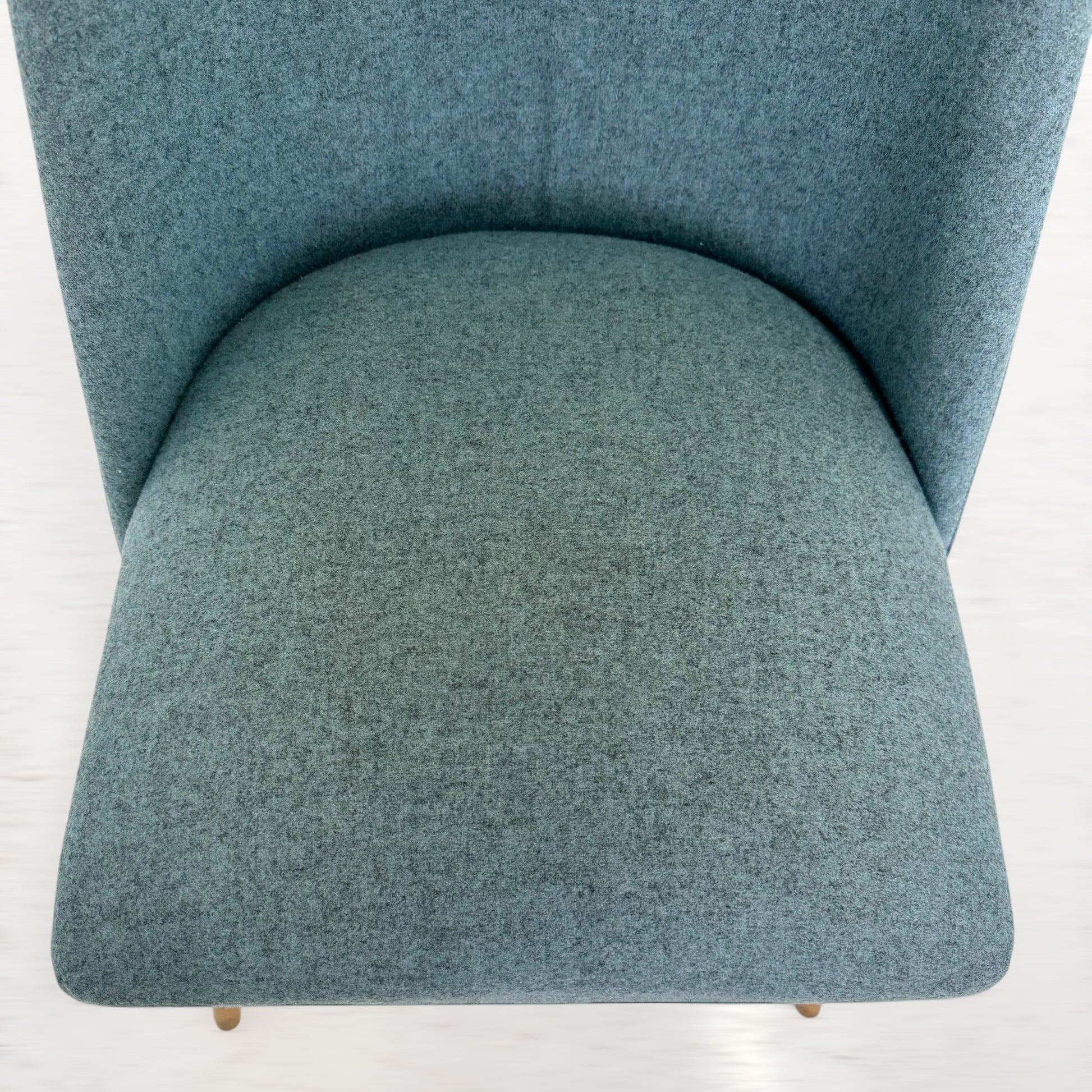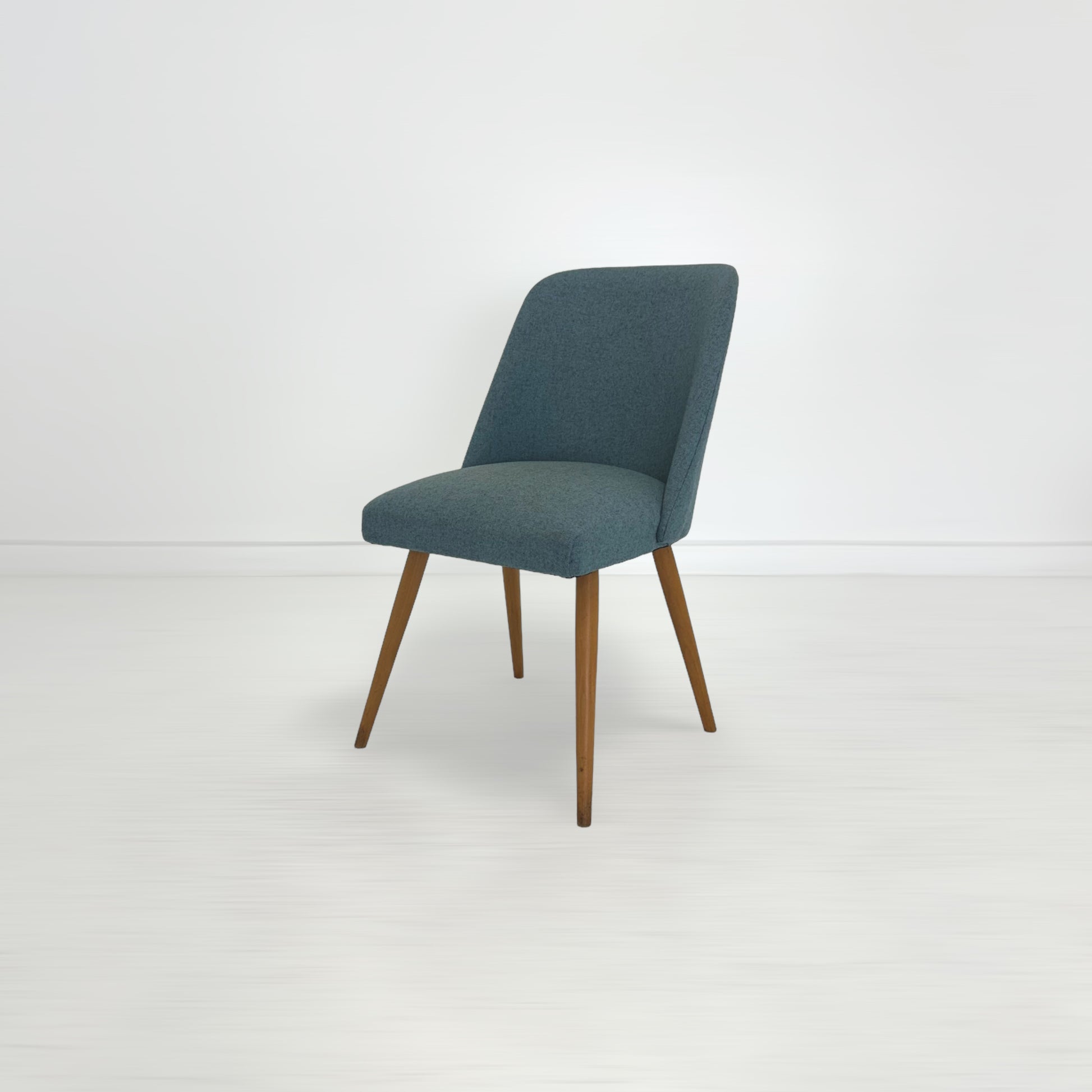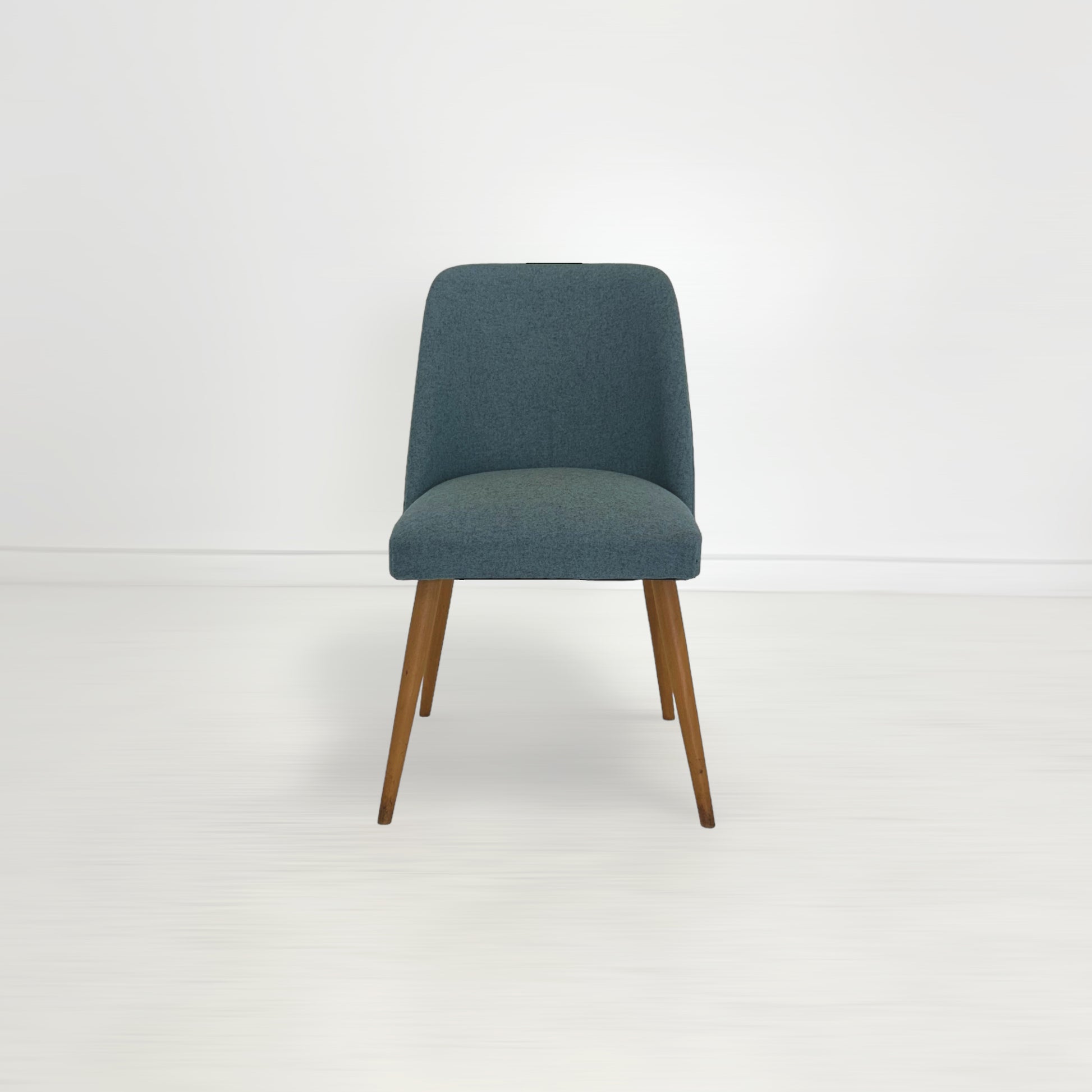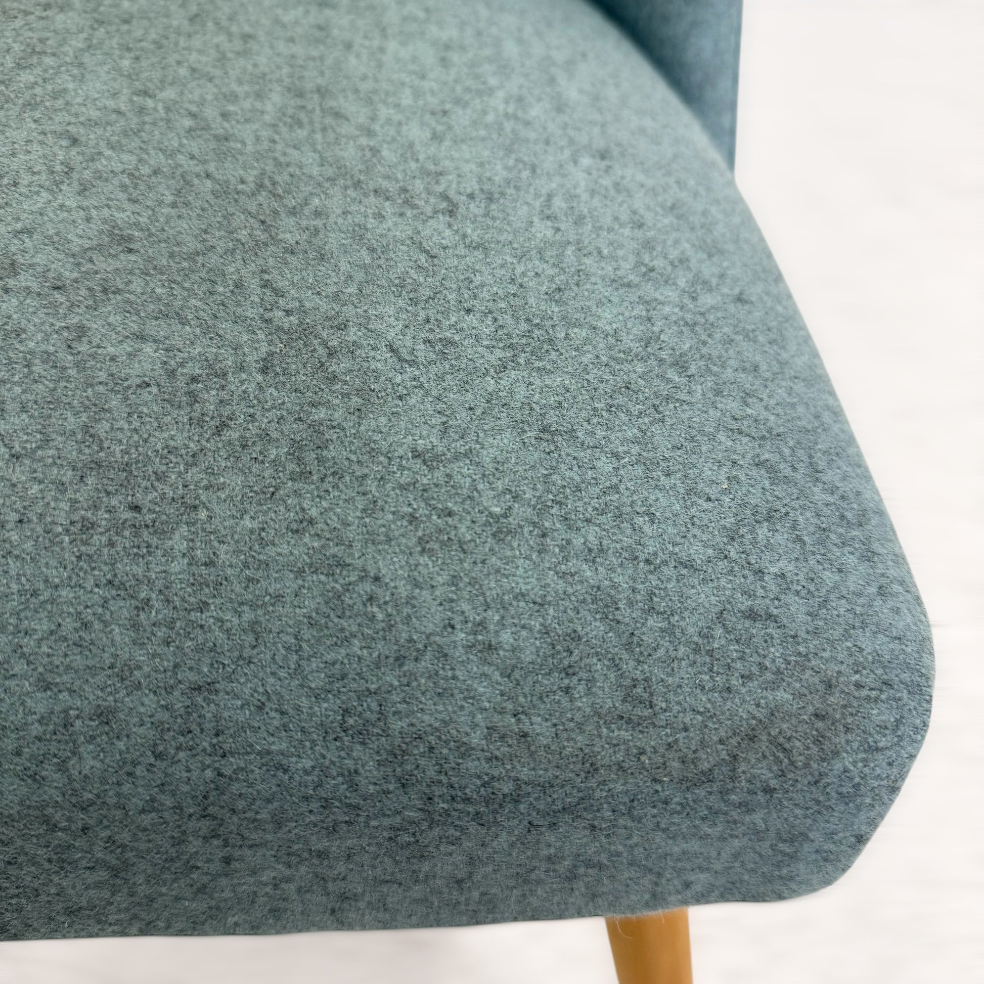 ファブリックのきれいな水色と、ビンテージの程良い味わいが感じられる木製の脚、愛らしい佇まいでリビングルームを温かい印象にまとめてくれそう。